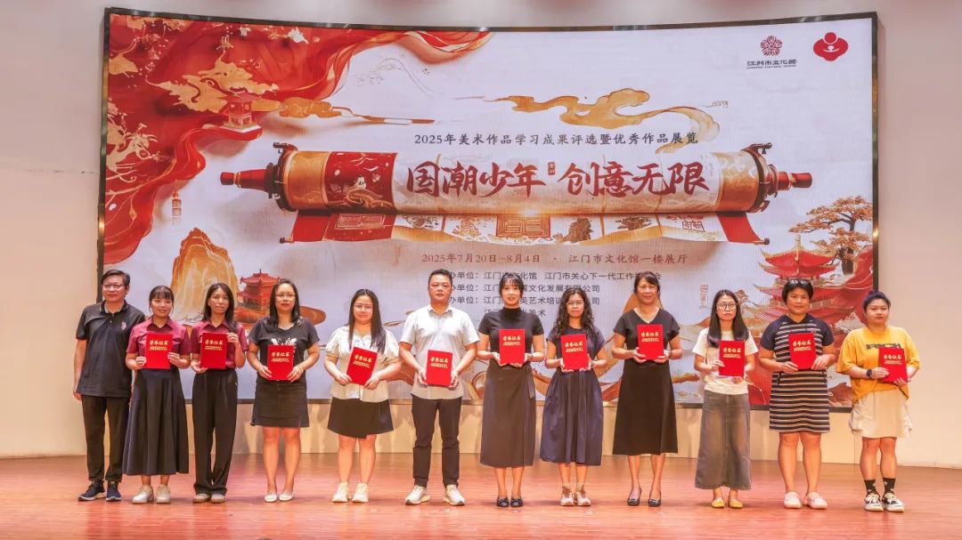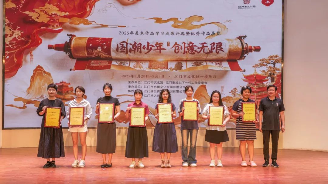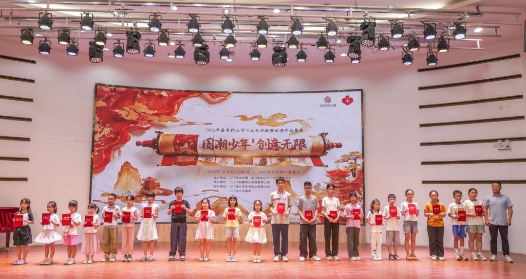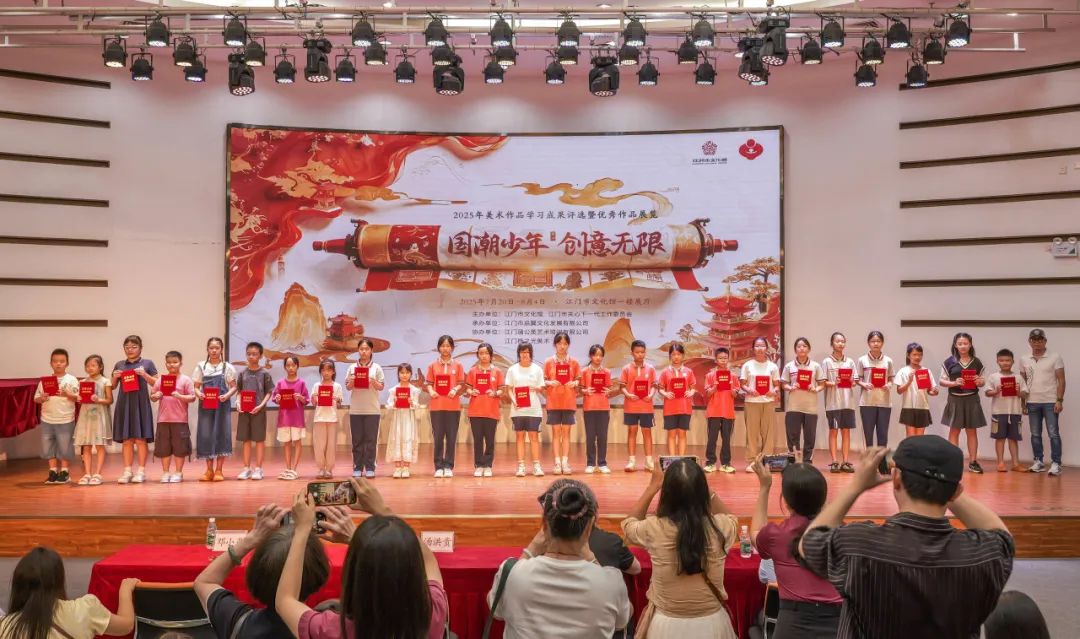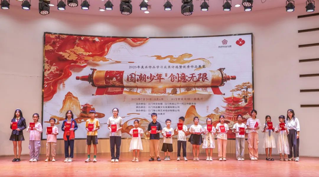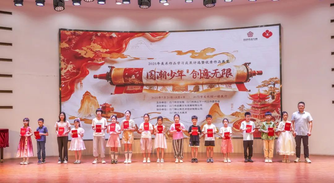 五千年文脉跃然纸上,新时代少年执笔生辉。7月22日,由江门市文化馆、江门市关心下一代工作委员会主办,江门市启翼文化发展有限公司承办,江门蒲公英艺术培训有限公司、江门杨之光美术协办的2025《国潮少年 创意无限》美术作品学习成果评选颁奖暨优秀作品展览开幕仪式在江门市文化馆举行。江门市文化馆副馆长张思斌、广东省美术家协会会员汤洪贵、江门市民间文艺家副主席陈白山等领导嘉宾以及参与此次活动的师生代表们齐聚一堂、共襄盛举。