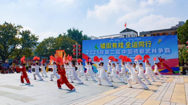 11月16日上午,江门长堤历史文化街区青年广场上锣鼓喧天、旌旗招展,由江门市文化广电旅游体育局、五邑大学体育部指导,江门市文化馆、江门市武术协会联合主办的“墟街有戏 全运同行 ——2025年第二届中国侨都武林争霸”在此精彩上演。本次活动涵盖武术、搏击、龙狮等多个竞赛项目,总参与人数超过270人,齐聚侨乡武林精英,以武会友,以赛传情,在百年骑楼的见证下,奏响了一曲传统与现代交织、体育与文化共鸣的雄浑乐章。