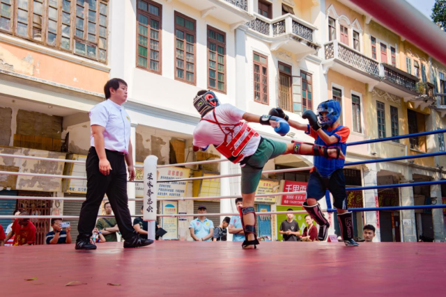 “青少年搏击争霸”环节同样精彩纷呈。本次设置的短兵和搏击项目是国家体育总局武术管理中心重点推广的双人对抗项目,是中国武术持械对抗与徒手对抗的两种重要表现形式,也是广受欢迎的武术进校园项目。来自5个代表队的22名青少年搏击选手,在11个级别的比赛中奋勇角逐、激战争霸。擂台上,少年武者们拳风凌厉,腿法迅猛,每一次精准的出拳都引来观众阵阵惊呼,既展现了传统武术的沉稳厚重,又彰显出新时代青少年的蓬勃朝气。整个青年广场沉浸在紧张刺激又热血沸腾的氛围中,掌声、喝彩声、助威声此起彼伏,汇成一曲动人的武术交响乐。经过激烈角逐,活动为各级别的胜出者进行颁奖,这不仅是对青少年武者拼搏精神的肯定,更是对侨乡武术传承的美好见证。