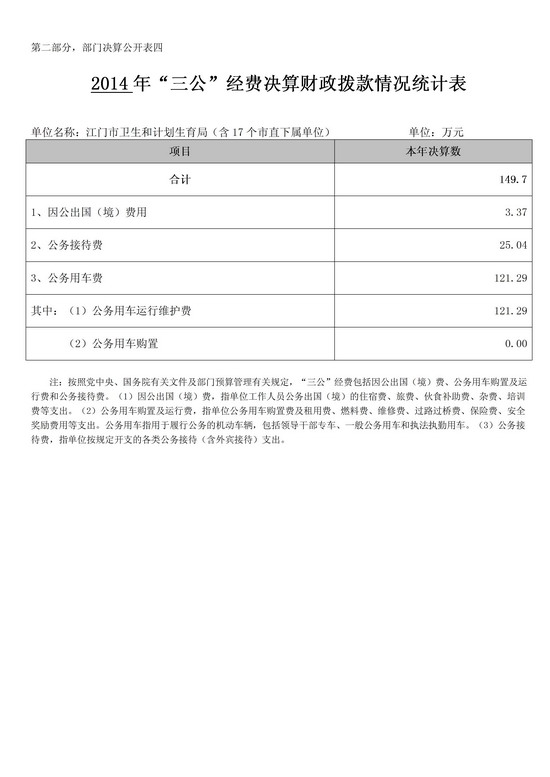 2014年江门市卫生和计划生育局(含17个市直下属单位)用财政拨款开支的出国(境)经费、车辆购置及运行费、公务接待费(简称“三公”经费)支出合计149.7万元。