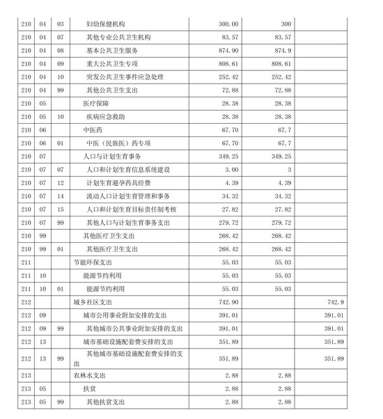 3、医疗卫生与计划生育(类)医疗卫生管理事务(款)行政运行(项)决算支出2.39万元;其他医疗卫生管理事务(项)决算支出5万元;公立医院(款)综合医院(项)决算支出11.44万元;中医(民族)医院(项)决算支出59.61万元;职业病防治医院(项)决算支出171.92万元;其他专科医院(项)决算支出120万元;其他公立医院支出(项)401.73万元;基层医疗卫生机构(款)乡镇卫生院(项)决算支出1050万元;其他基层医疗卫生机构(项)决算支出5万元;公共卫生(款)疾病预防控制机构(项)决算支出251.02万元;卫生监督机构(项)决算支出116.93万元;妇幼保健机构(项)决算支出300万元;其他专业公共卫生机构(项)决算支出83.57万元;基本公共卫生服务(项)决算支出874.9万元;重大公共卫生专项(项)决算支出808.61万元;突发公共卫生事件应急处理(项)决算支出252.42万元;其他公共卫生支出(项)决算支出72.88万元;医疗保障(款)疾病应急救助(项)决算支出28.38万元;中医药(款)中医(民族医)药专项(项)决算支出67.7万元;人口与计划生育事务(款)人口和计划生育信息系统建设(项)决算支出3万元;计划生育避孕药具经费(项)决算支出4.39万元;流动人口计划生育管理和事务(项)决算支出34.32万元;人口和计划生育目标责任制考核(项)决算支出27.82万元;其他人口和计划生育事务(项)决算支出279.72万元;其他医疗卫生(款)其他医疗卫生(项)决算支出268.42万元。