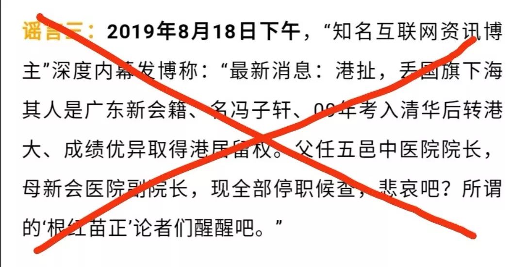 2019年8月15日起,微博和微信有传闻称:“快讯:香港新闻报道,这个丢国旗进海的港毒废青,前天已经被香港警方逮捕。经查,这个汉奸叫冯子轩,是港大学生,广东新会高考状元,09年考入清华转港大,因考试成绩优异而被批准入户香港并被洗脑成为港毒分子。其父亲是新会五邑中医院院长,母亲是妇幼保健院副院长,因受其儿子影响双双被调查,并被查出有经济问题,现已全部停职。这就是从小只培养孩子钢琴,奥数,外语等,忽视了做人的教育,爱国情怀教育的悲剧!!!有国才有家,若国家动荡不安,家又何在!”(以下简称“快讯”)