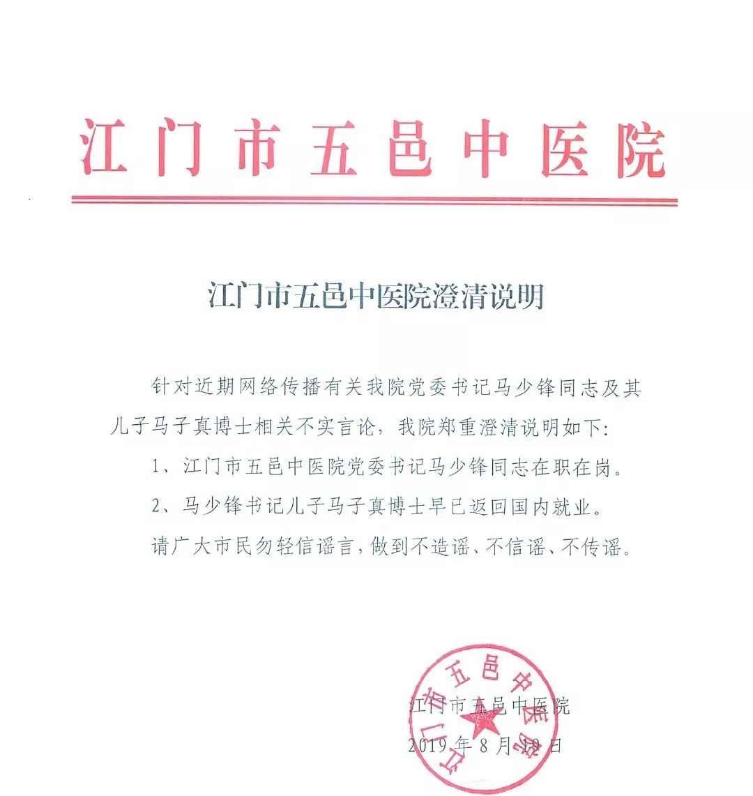 江门市五邑中医院在2019年8月19日中午发布澄清说明:“针对近期网络传播有关我院党委书记马少锋同志及其儿子马子真博士相关不实言论,我院郑重澄清说明如下: