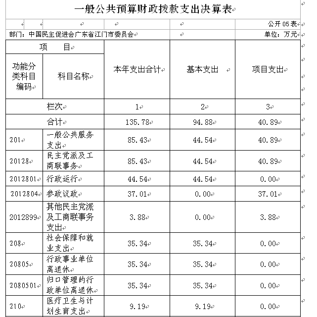 民进江门市委员会2015年度一般公共预算财政拨款支出合计135.78万元,占本年支出合计的95%。与2014年相比,增加12.48万元,增长9%。
