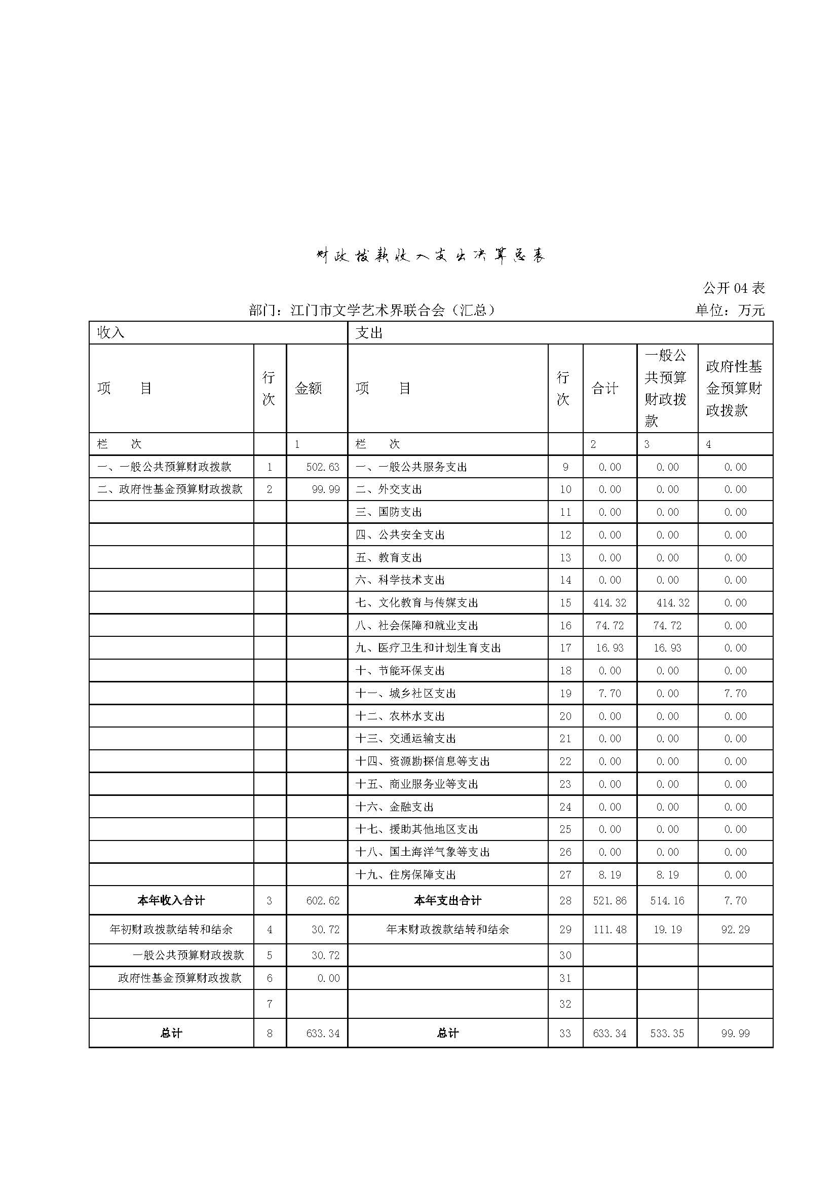 四、财政拨款收入支出决算总表