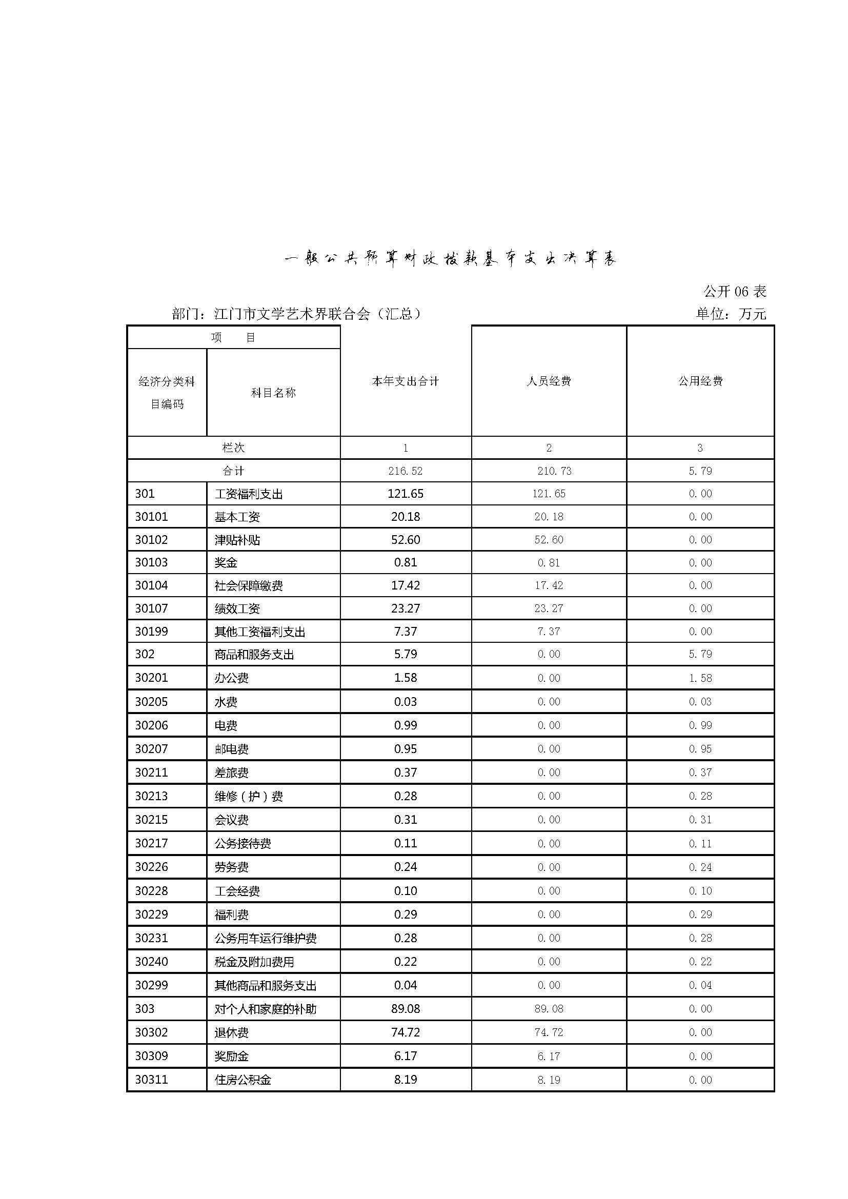 江门市文学艺术界联合会2015年度一般公共预算财政拨款基本支出 216.52万元,其中: