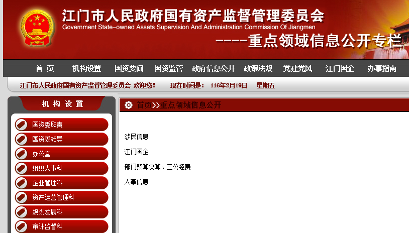 (五)落实2015年政府信息公开工作要点分工方案的要求,要求市属重点企业和直接监管企业在企业网站上公布企业基本信息、经济运行状况等应公开信息,并在市国资委网站开设“江门国企”栏目,通过链接企业网站和公布企业信息两种方式推进国有企业信息公开工作。