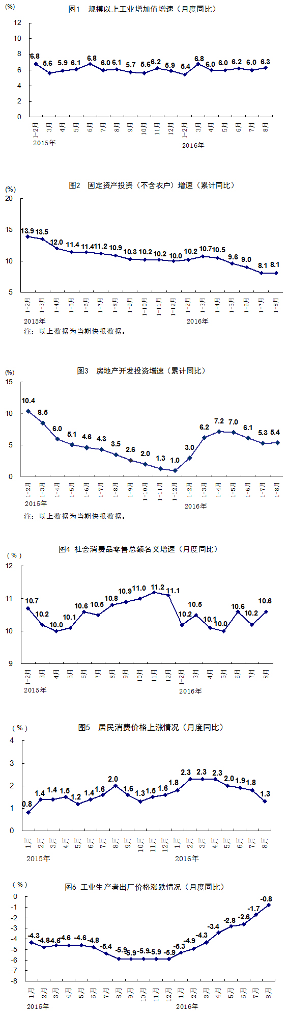 8月份,全国规模以上工业增加值按可比价格计算同比增长6.3%,增速比上月加快0.3个百分点,比上年同期加快0.2个百分点。分经济类型看,国有控股企业增加值同比增长3.6%,集体企业下降4.1%,股份制企业增长6.4%,外商及港澳台商投资企业增长6.7%。分三大门类看,采矿业增加值同比下降1.3%,制造业增长6.8%,电力、热力、燃气及水生产和供应业增长7.0%。工业结构继续优化,高技术产业和装备制造业增加值同比分别增长11.8%和10.8%,增速分别比规模以上工业快5.5和4.5个百分点。规模以上工业企业产销率达到98.1%。从环比看,8月份全国规模以上工业增加值比上月增长0.53%。1-8月份,规模以上工业增加值同比增长6.0%。