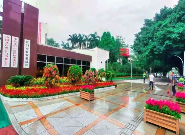 (二)江海区。在江门东站广场、江南文化广场、釜山公园、陈少白广场、富田口袋公园、白水带体育公园、建星公园、文昌苑口袋公园等节点增设花卉组景8组(其中4组有灯光),种植和摆设花卉15万盆。