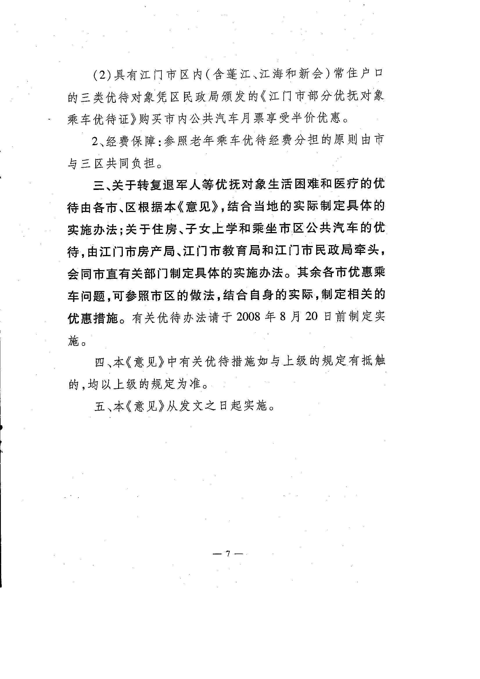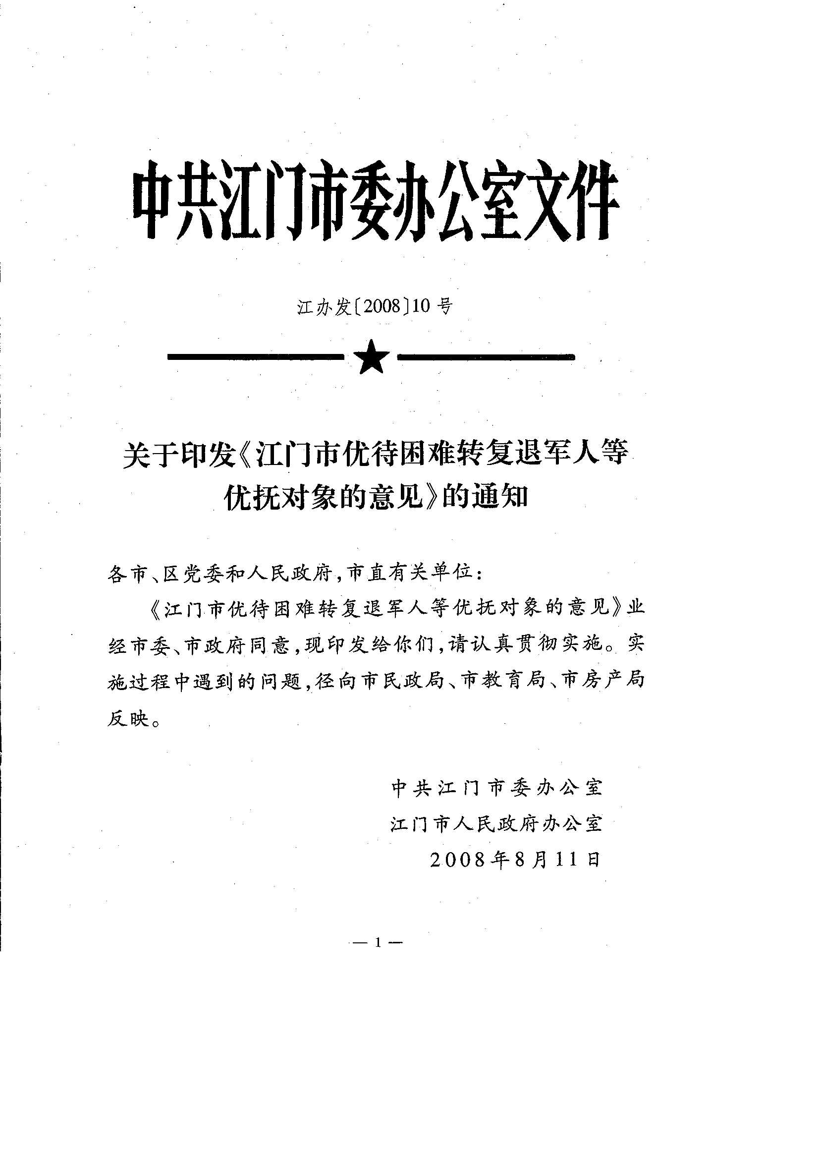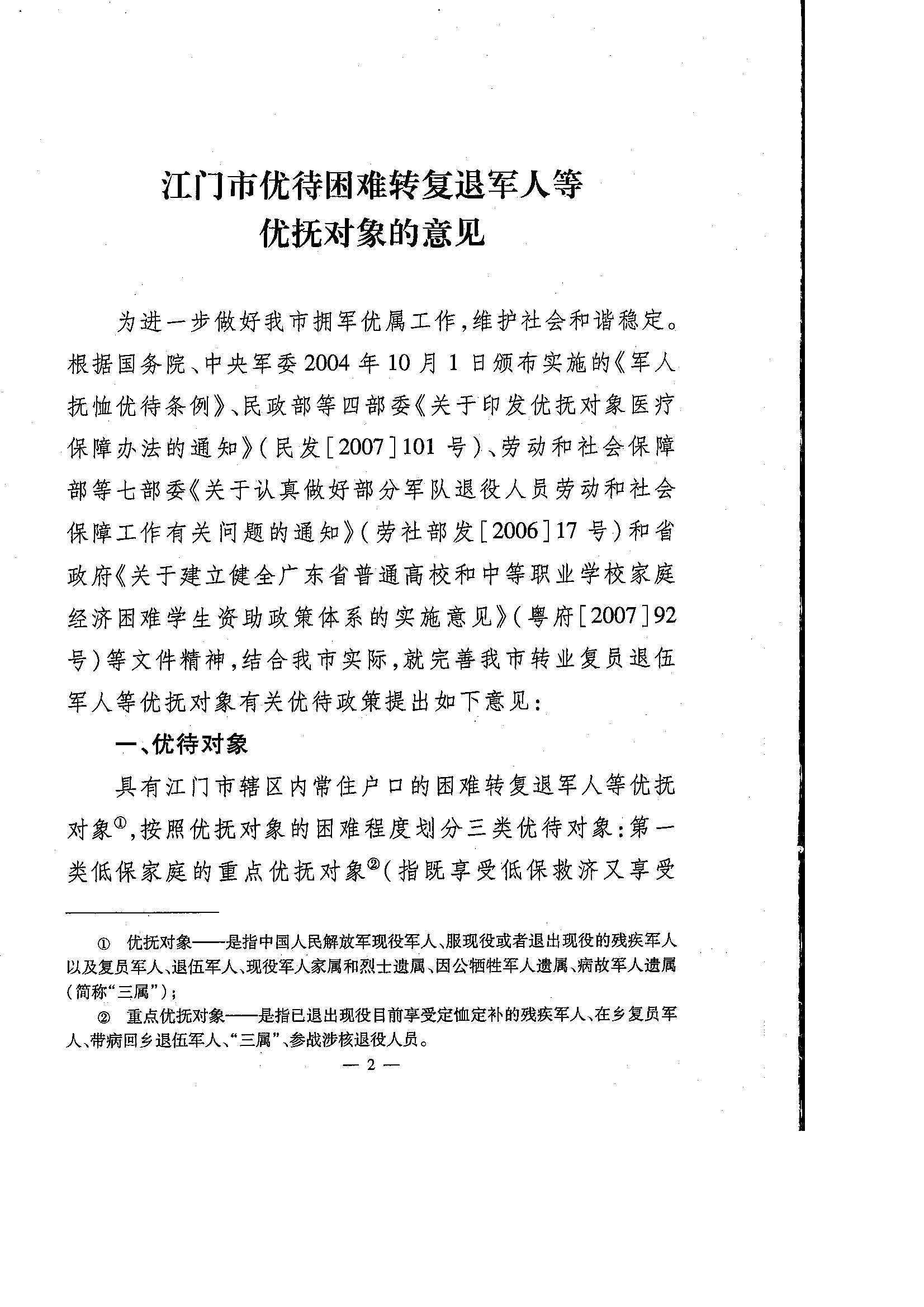 关于印发《江门市优待困难转复退军人等优抚对象的意见》的通知
