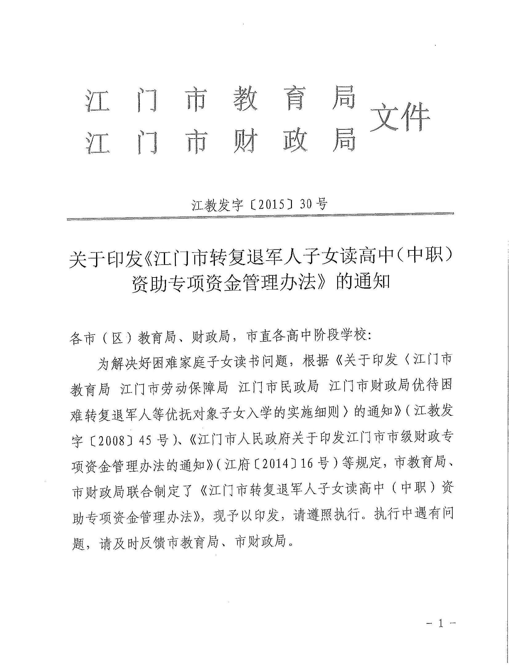 关于印发《江门市转复退军人子女读高中(中职)资助专项资金管理办法》的通知