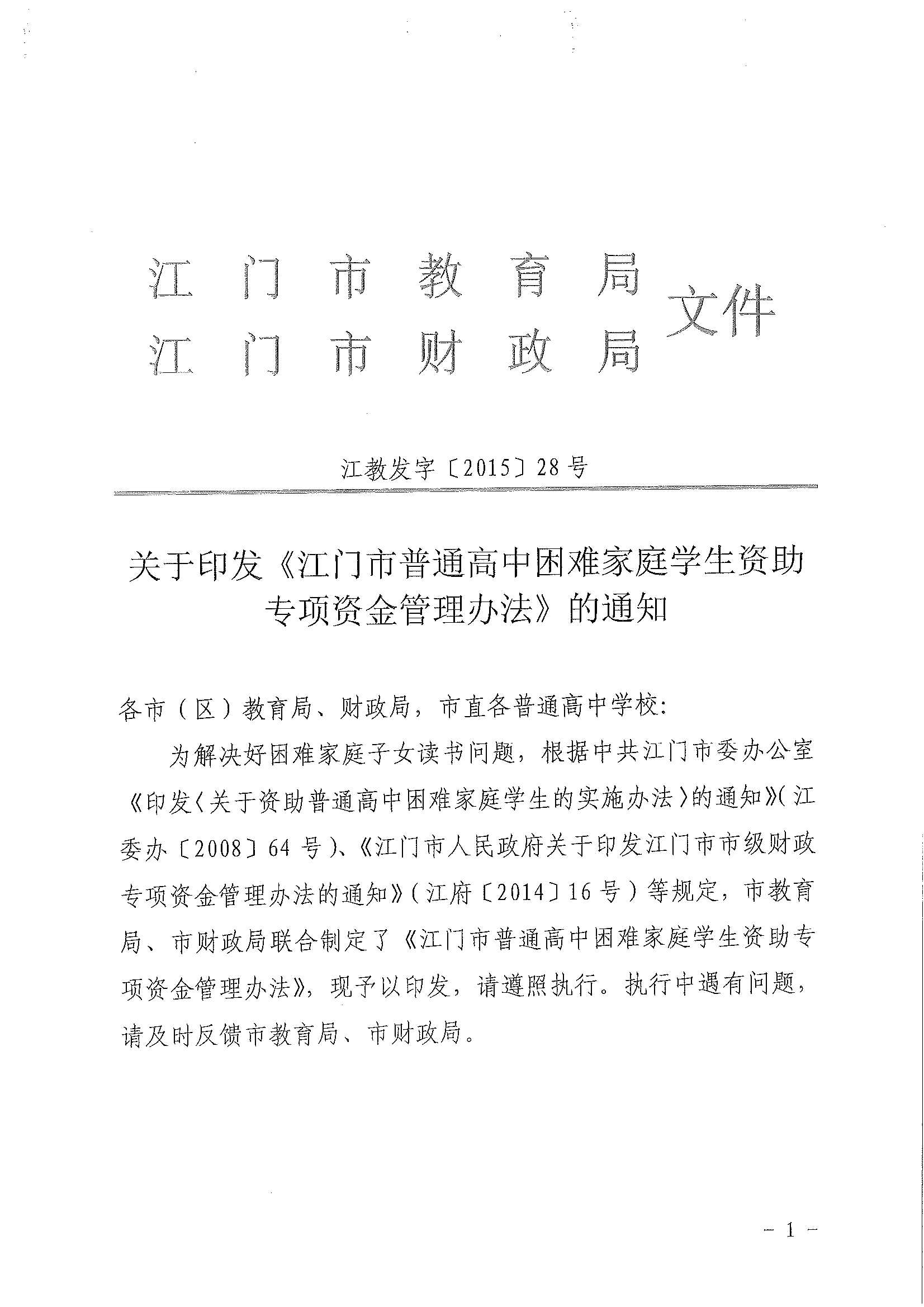 江门市普通高中困难家庭学生资助专项资金管理办法