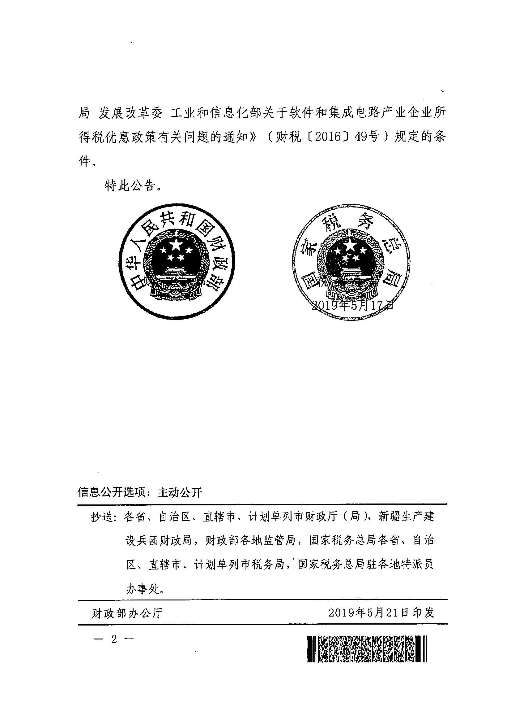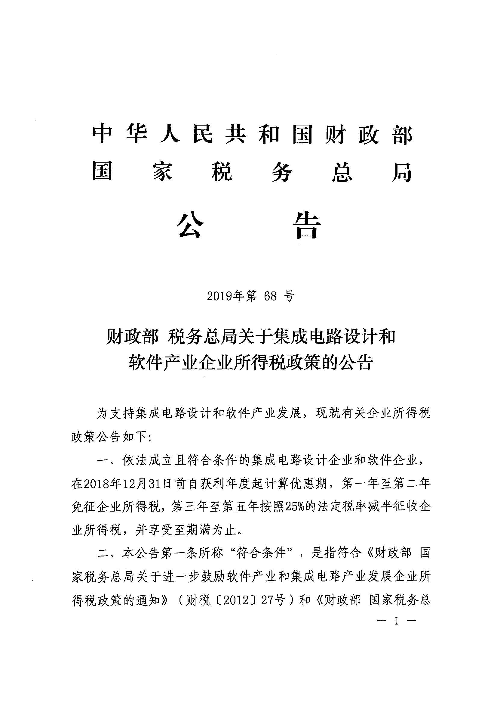财政部 税务总局关于集成电路设计和软件产业企业所得税政策的公告