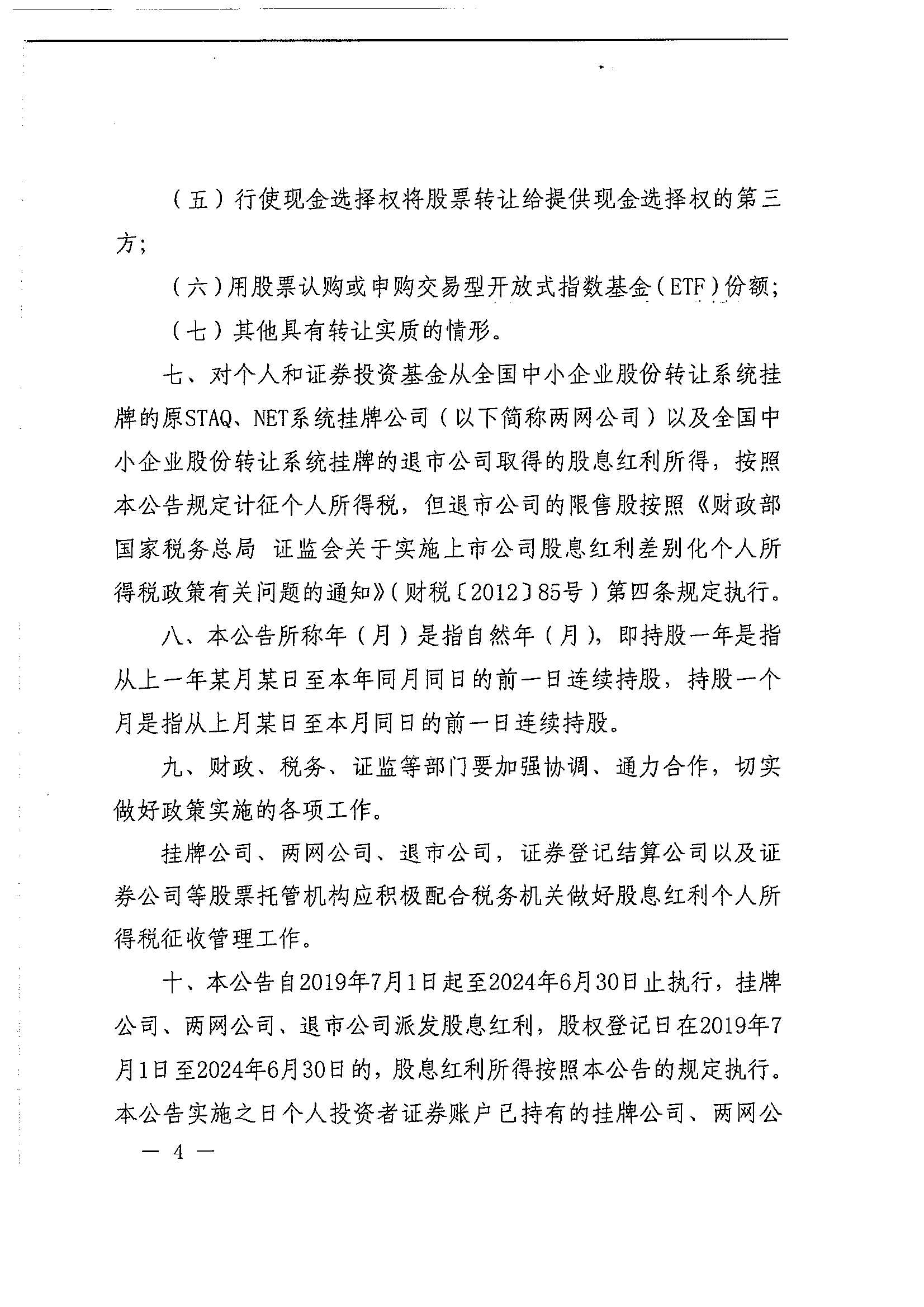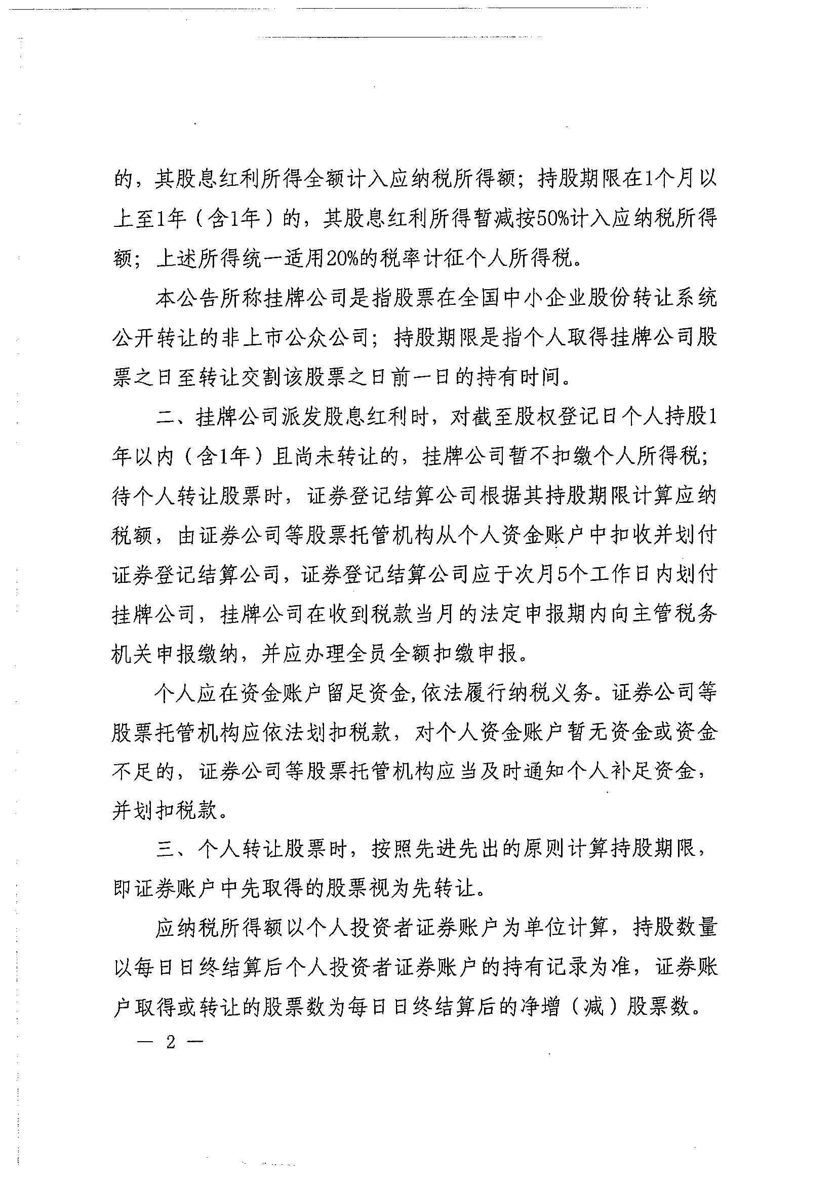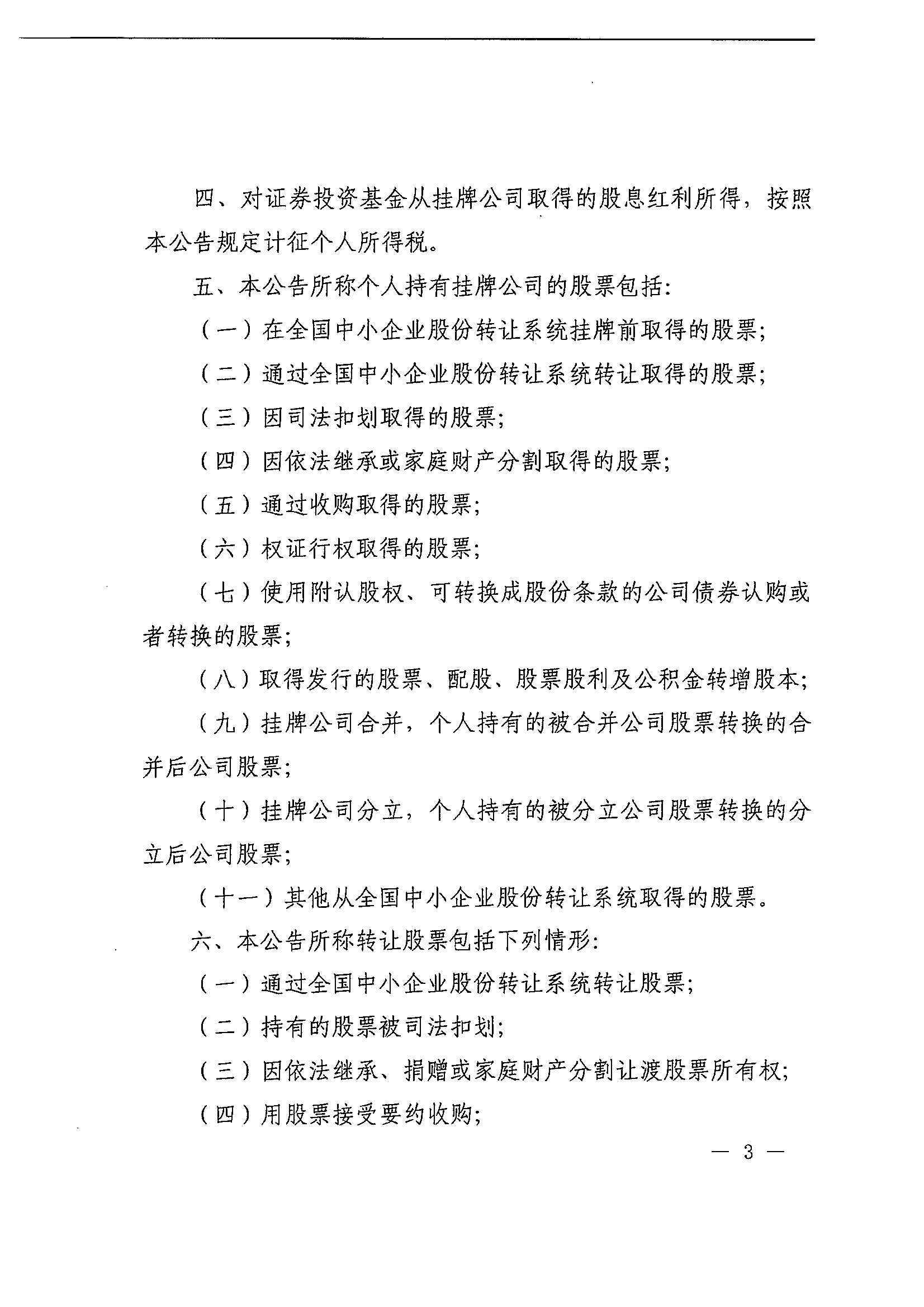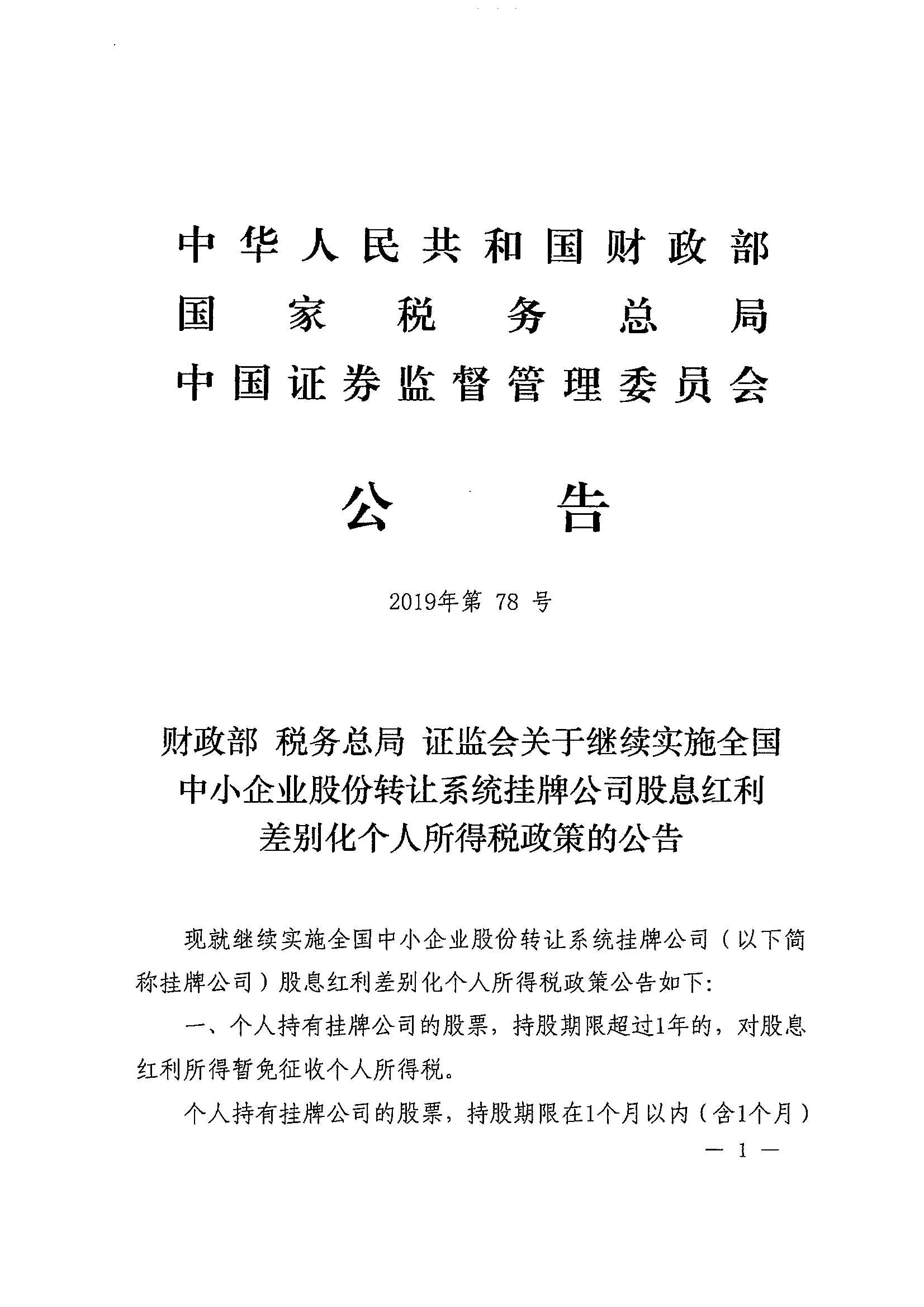 财政部 税务总局 证监会关于继续实施全国中小企业股份转让系统挂牌公司股息红利差别化个人所得税政策的公告
