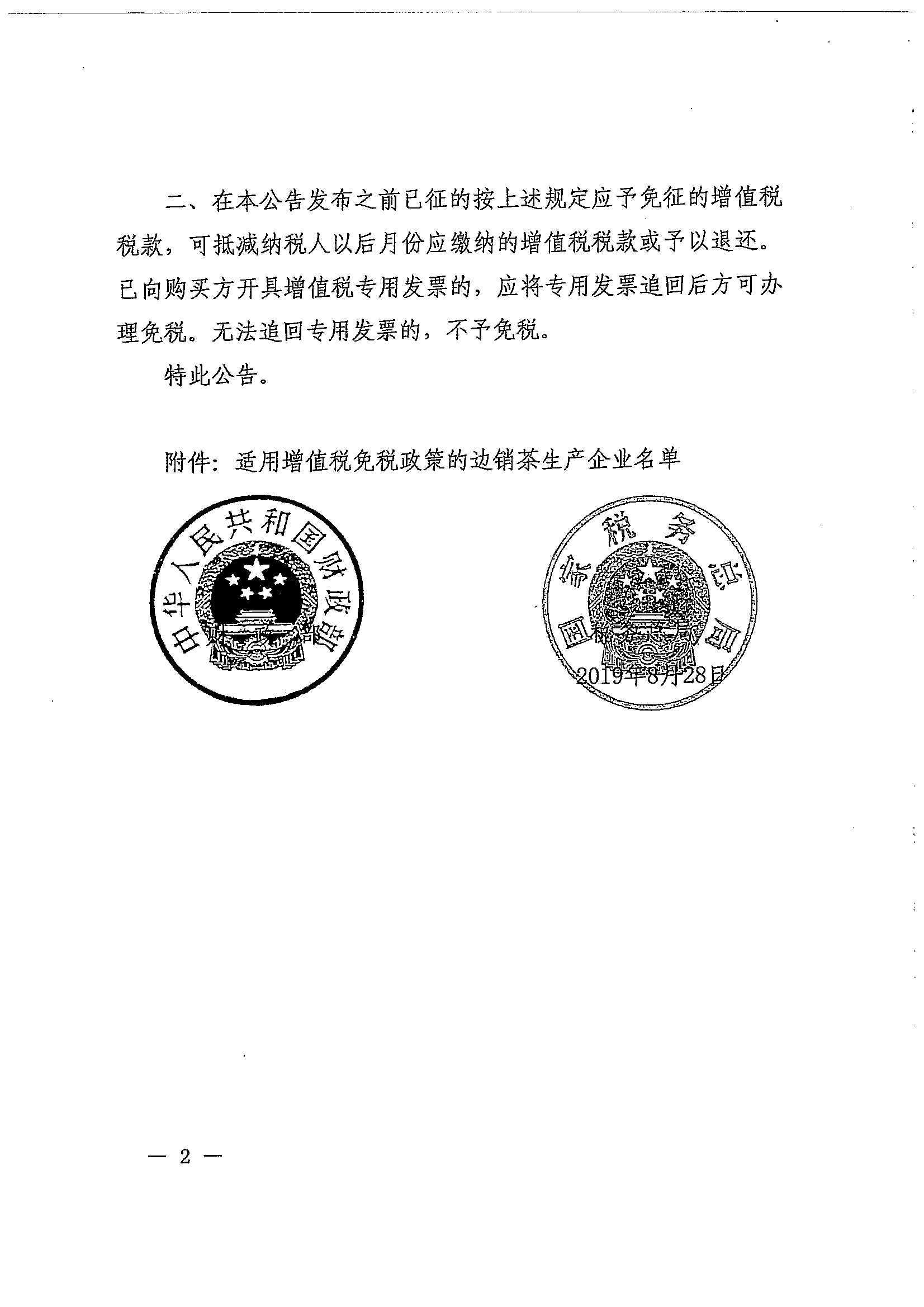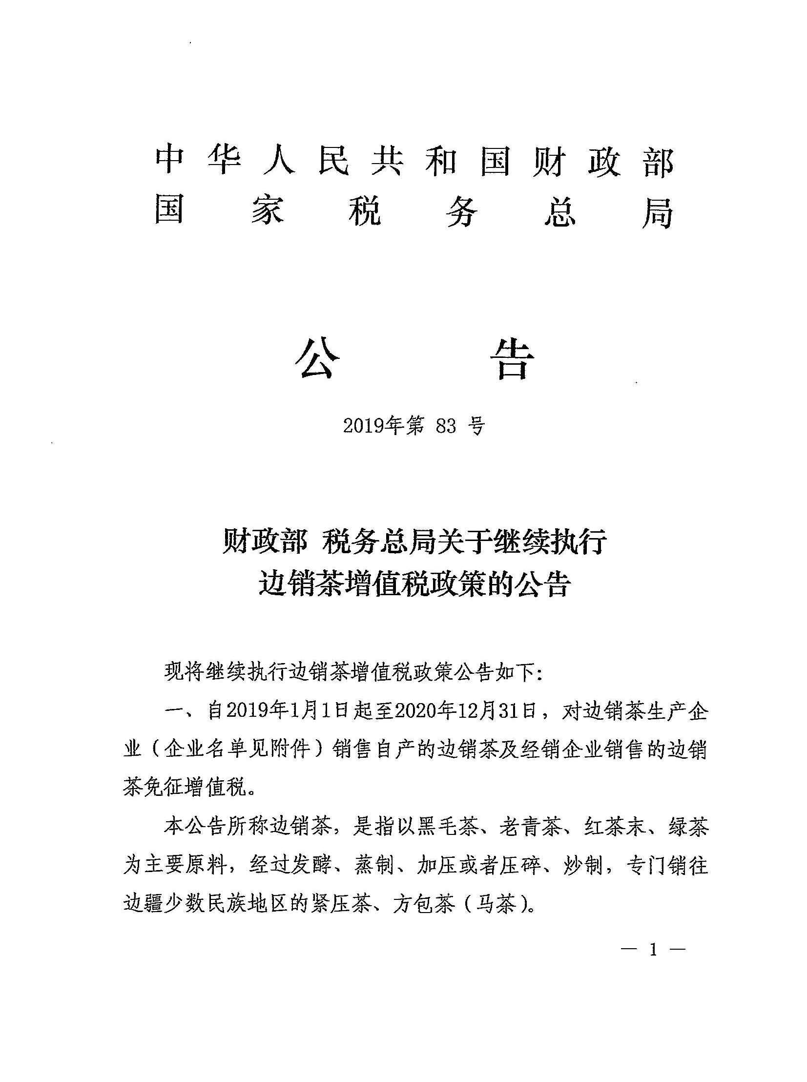 财政部 税务总局关于继续执行边销茶增值税政策的公告