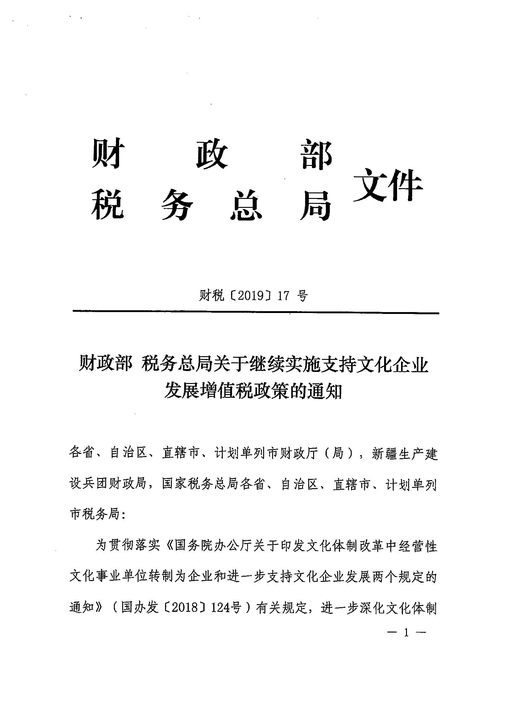 财政部 税务总局关于继续实施支持文化企业发展增值税政策的通知