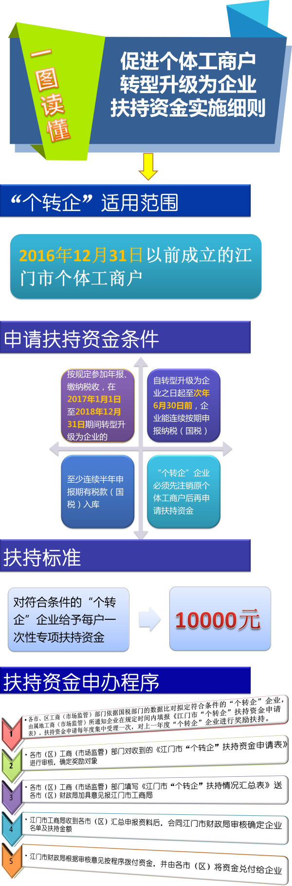 (一)各市、区工商(市场监管)部门依据国税部门的数据比对拟定符合条件的“个转企”企业,由属地工商(市场监管)所通知企业在规定时间内填报《江门市“个转企”扶持资金申请表》。扶持资金申请每年度集中受理一次,对上一年度“个转企”企业进行奖励扶持。具体时间以江门市工商局发布通知为准。如当年度“个转企”企业未能在规定时间内提出申请的,视为自动放弃申请,不得再次跨年度申请扶持资金。