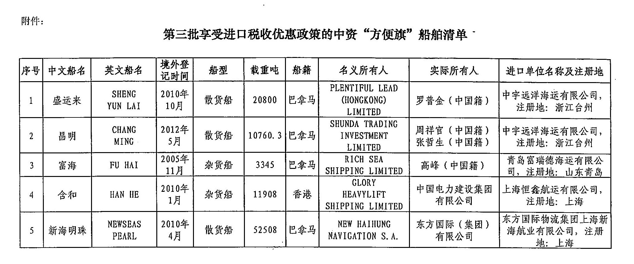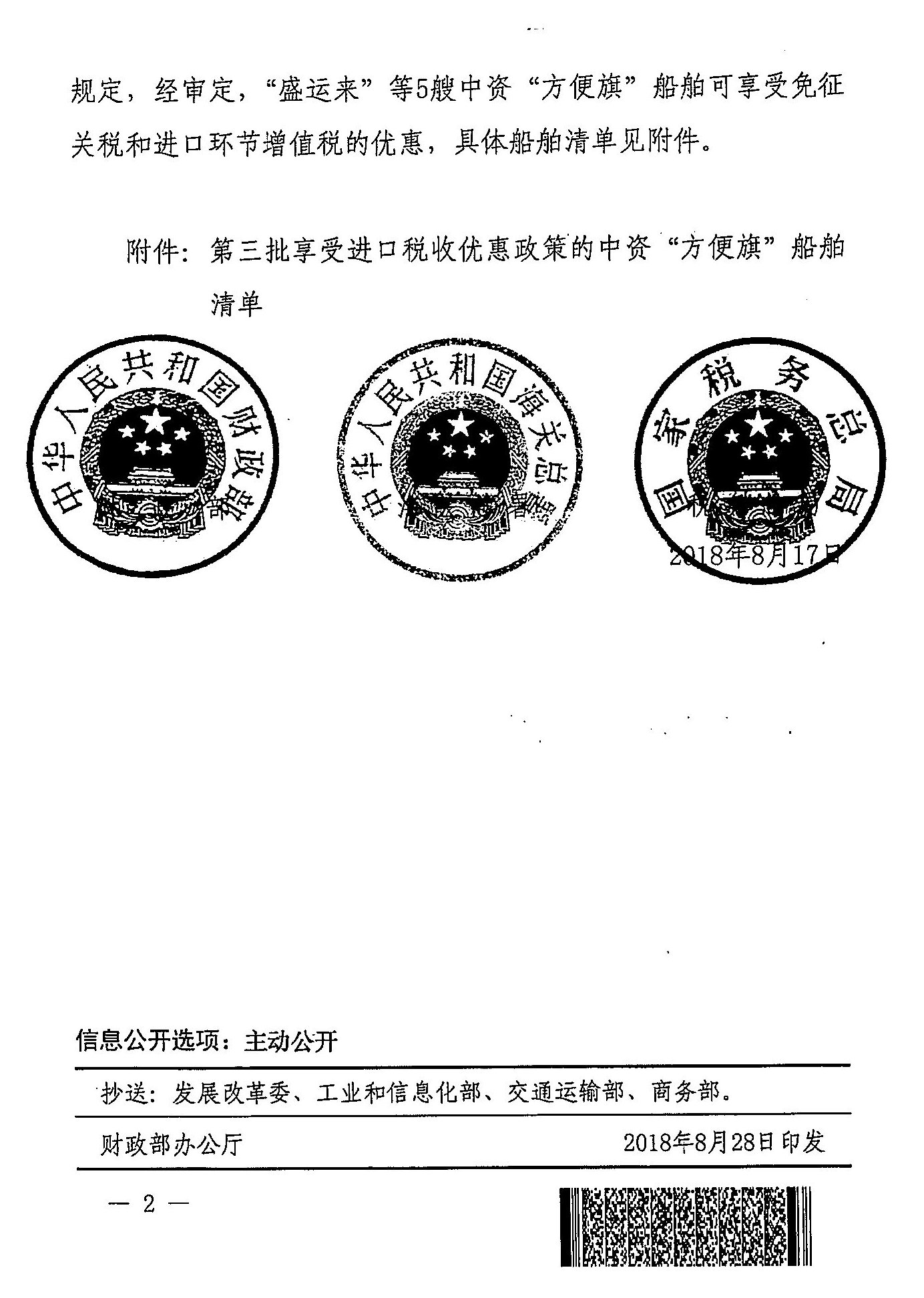 财政部 海关总署 税务总局关于第三批享受进口税收优惠政策的中资“方便旗”船舶清单的通知