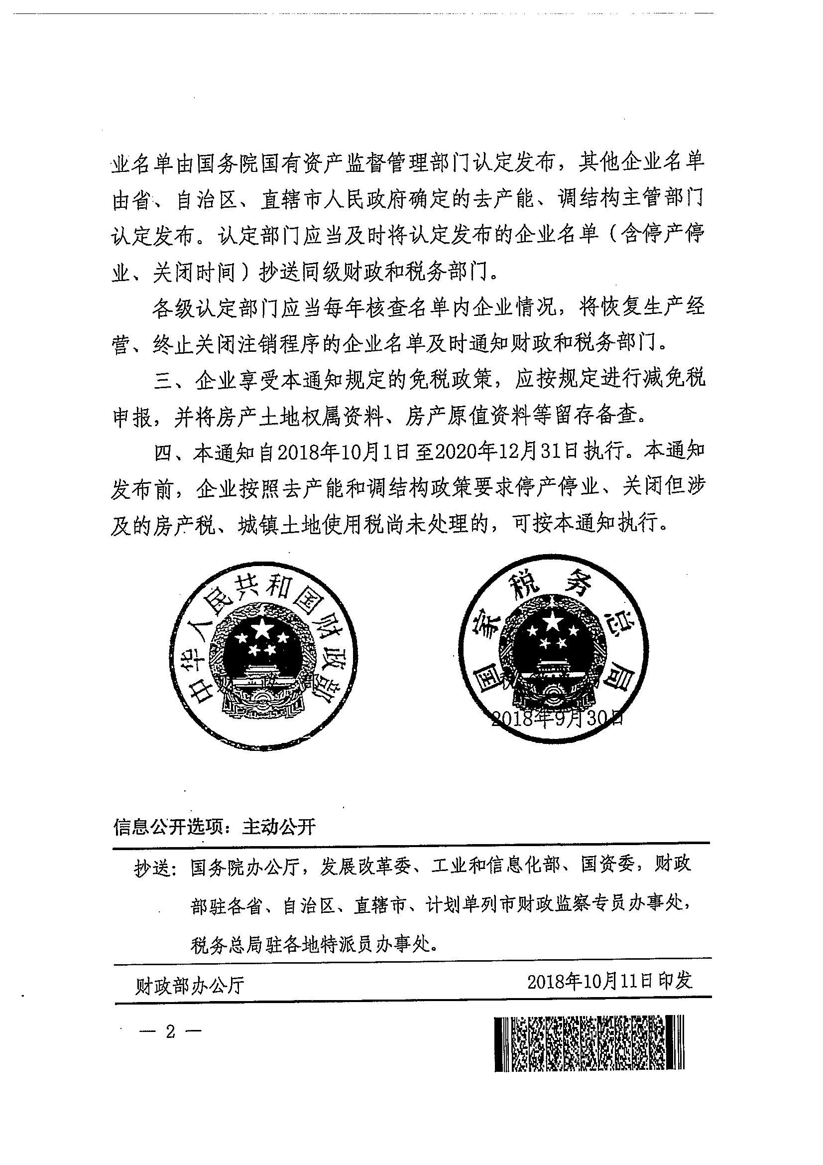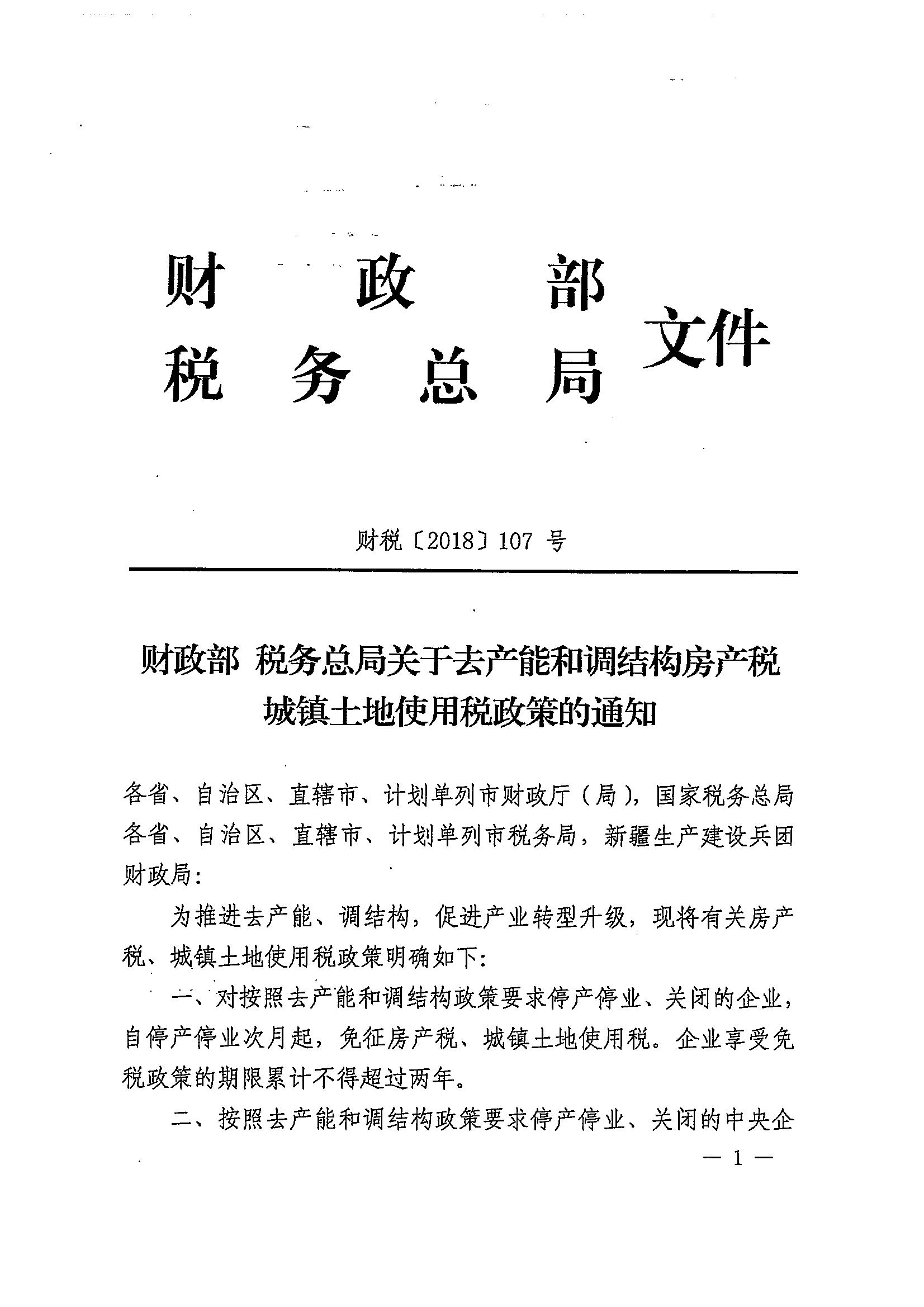 财政部 税务总局关于去产能和调结构房产税城镇土地使用税政策的通知