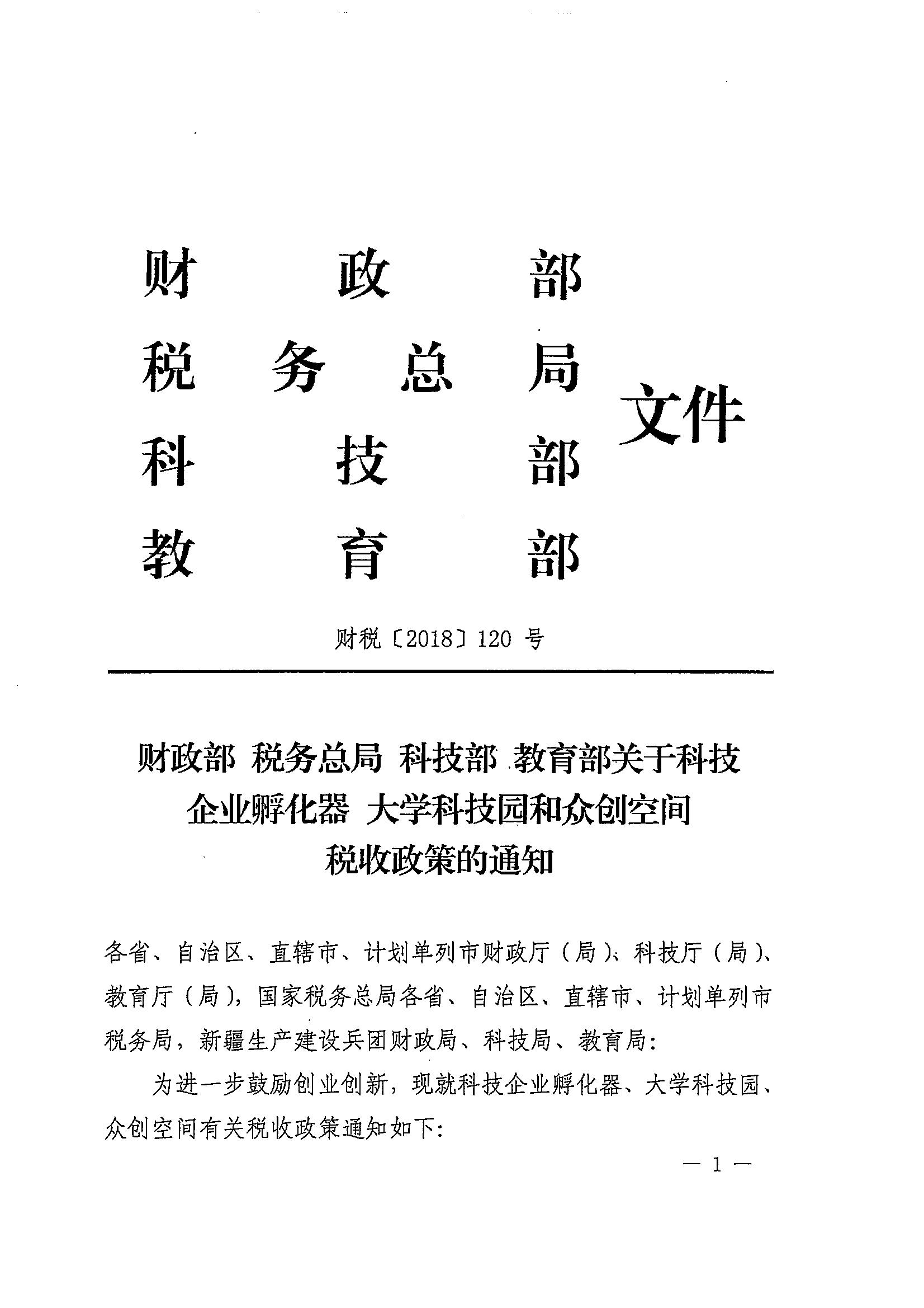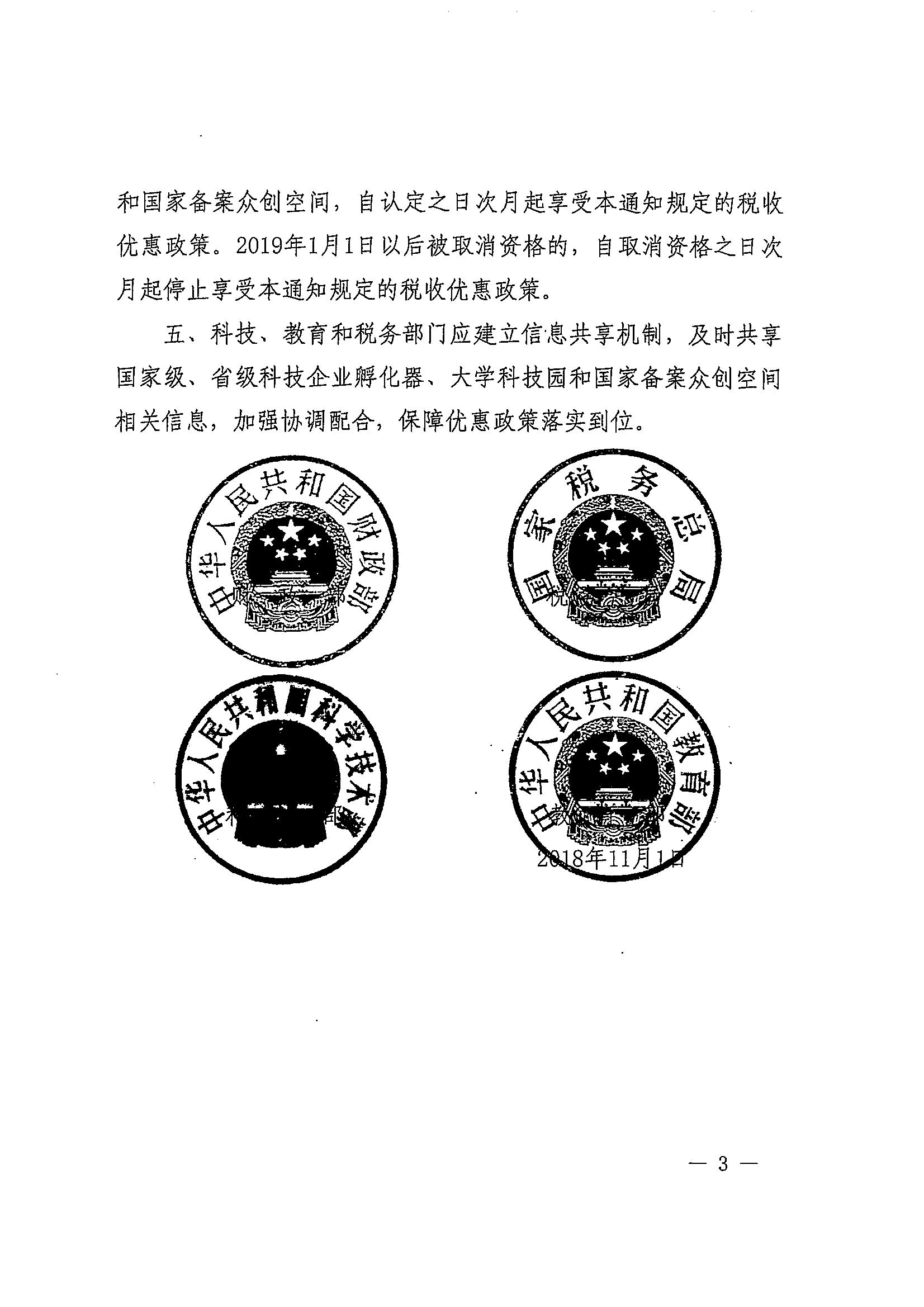 财政部 税务总局 科技部 教育部关于科技企业孵化器 大学科技园和众创空间税收政策的通知