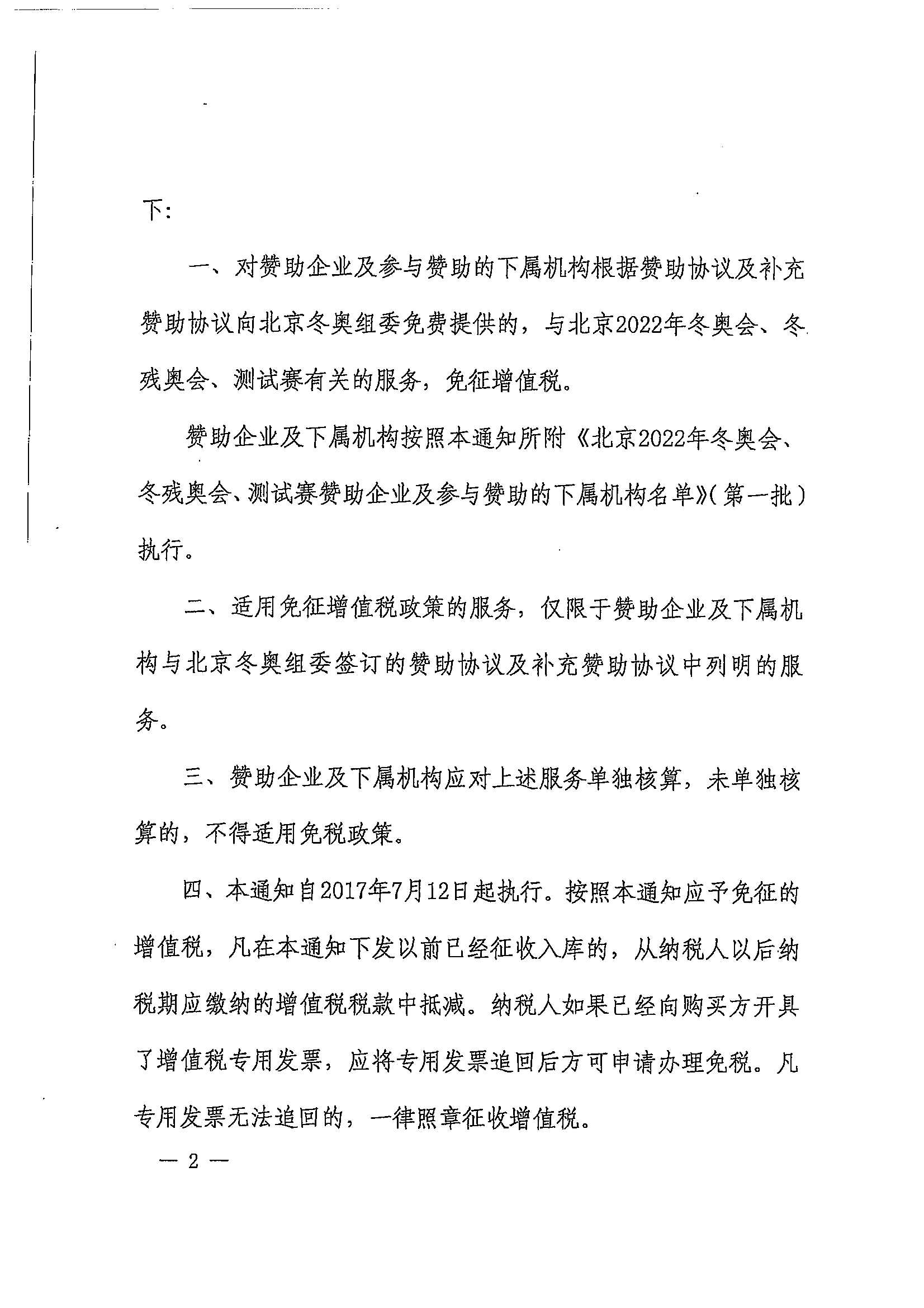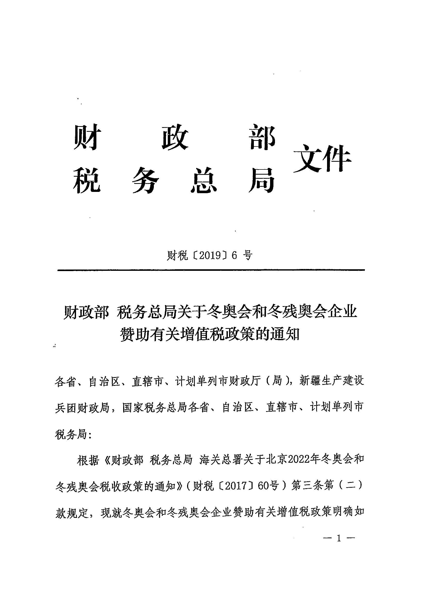 财政部 税务总局关于冬奥会和冬残奥会企业赞助有关增值税政策的通知