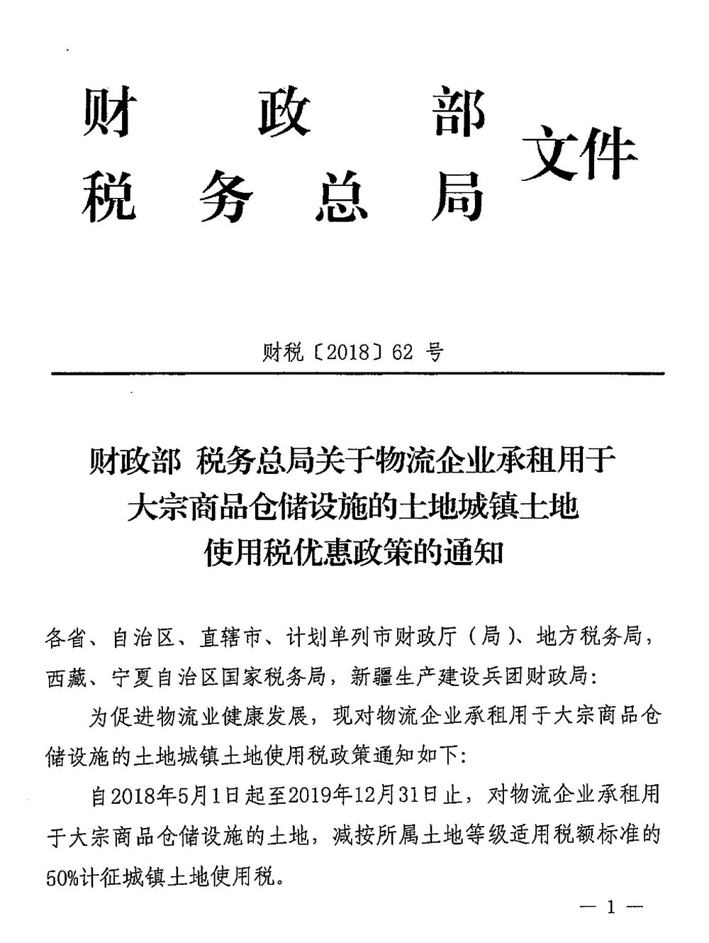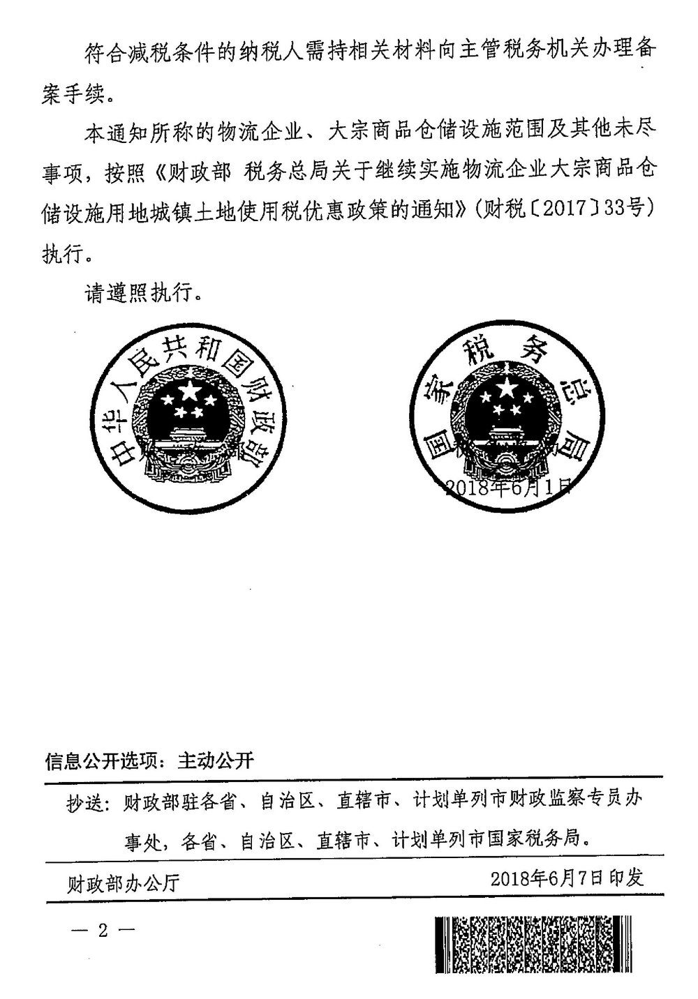 财政部 税务总局关于物流企业承租用于大宗商品仓储设施的土地城镇土地使用税优惠政策的通知