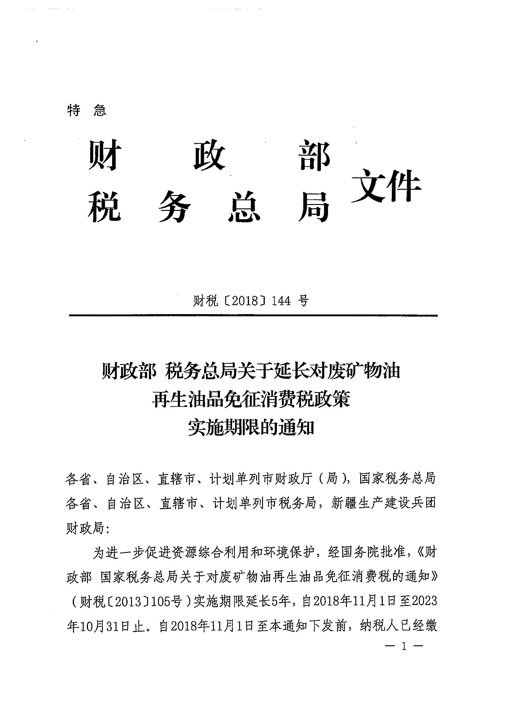 财政部 税务总局关于延长对废矿物油再生油品免征消费税政策实施期限的通知