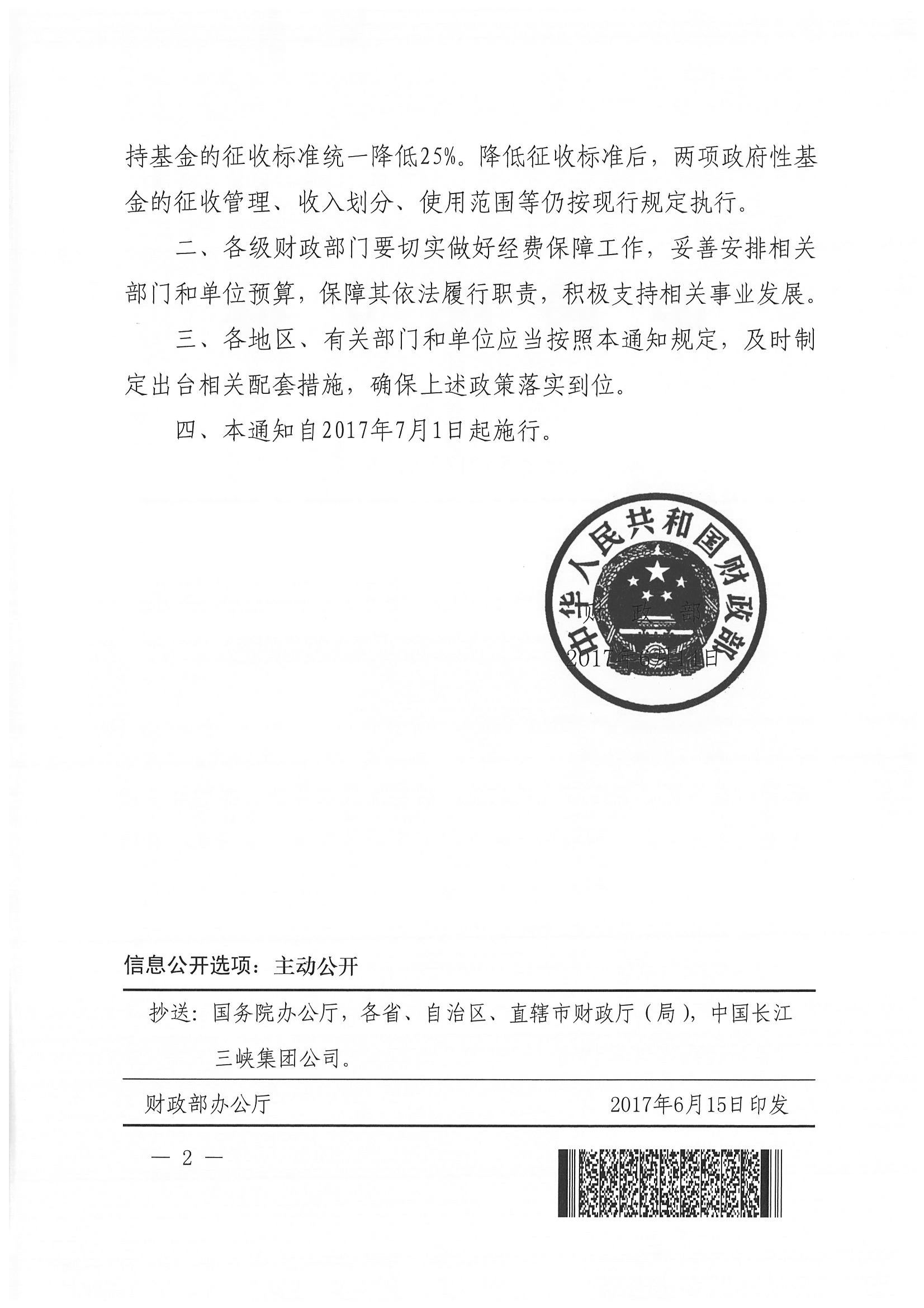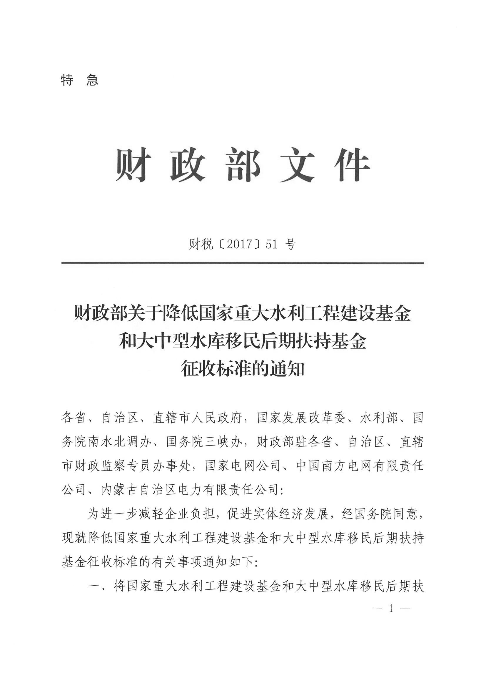 财政部关于降低国家重大水利工程建设基金和大中型水库移民后期扶 持基金征收标准的通知