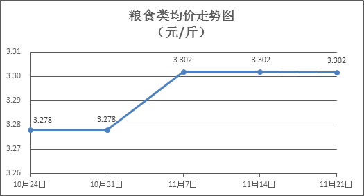 粮食类商品价格平稳。本周所监测的6种粮食商品价格均持平,综合零售均价为3.302元/斤。其中:晚籼米、丝苗米、标准粉零售均价分别为每斤3.34元、3.52元、3.12元,环比均持平。