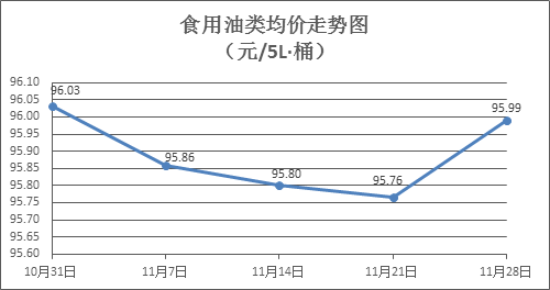 食用油类商品价格微幅上涨。本周所监测的9种食用油(5L装)商品价格波动情况为5涨4平,综合零售均价为95.99元/桶,环比上涨0.24%。其中:鲁花花生油、玉米油零售均价分别为每桶158.58元、74.54元,环比分别上涨0.13%、上涨0.39%。