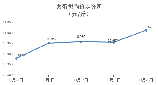 禽蛋类商品价格以涨为主。本周所监测的6种禽蛋类商品价格波动情况为5涨1跌,综合零售均价为11.013元/斤,环比上涨0.52%。其中:白条鸡、白条鸭零售均价分别为每斤20.42元、15.30元,环比分别上涨0.54%、上涨0.33%;红壳鸡蛋、鸭蛋零售均价分别为每斤6.95元、7.67元,环比分别上涨1.61%、下降0.26%。