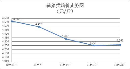 蔬菜类商品价格升降互现。本周所监测的32 种蔬菜商品价格波动情况为14涨16跌2平,综合零售均价为4.262元/斤,环比上涨0.21%。其中:涨幅居前的品种包括丝瓜、上海青、西洋菜,零售均价分别为每斤4.94元、3.65元、4.41元,环比分别上涨8.33%、7.99%、6.01%;跌幅居前的品种包括莴笋、菠菜、青尖椒,零售均价分别为每斤3.57元、5.31元、4.87元,环比分别下降6.05%、5.01%、4.88%。