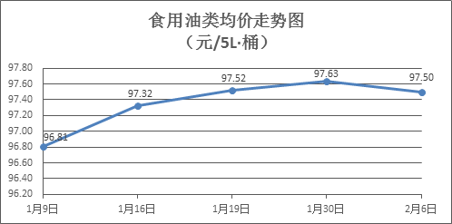 食用油类商品价格总体微降。本周所监测的9种食用油(5L装)商品价格波动情况为4涨4跌1平,综合零售均价为97.50元/桶,环比下降0.14%。其中:鲁花花生油、金龙鱼调和油零售均价分别为每桶159.24元、71.46元,环比分别下降0.16%、上涨0.39%。