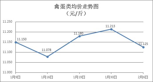 禽蛋类商品价格窄幅盘降。本周所监测的6种禽蛋类商品价格波动情况为3涨3跌,综合零售均价为11.125元/斤,环比下降0.79%。其中:白条鸡、白条鸭零售均价分别为每斤20.46元、15.43元,环比分别下降1.35%、下降2.03%;白壳鸡蛋、鸭蛋零售均价分别为每斤7.24元、7.87元,环比分别上涨1.12%、上涨0.38%。
