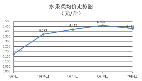 水果类商品价格微幅下调。本周所监测的6种水果商品价格波动情况为4跌2平,综合零售均价为6.432元/斤,环比下降0.49%。其中苹果、葡萄、梨零售均价分别为每斤7.14元、12.50元、6.12元,环比分别下降0.28%、持平、下降0.33%。
