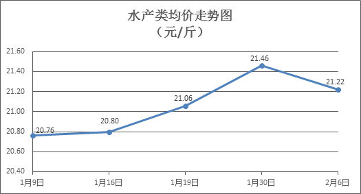 水产类商品价格小幅下降。本周所监测的10种水产商品价格波动情况为1涨7跌2平,综合均价为21.22元/斤,环比下降1.14%。其中:草鱼、鲫鱼、罗非鱼、基围虾零售均价分别为每斤11.46元、14.49元、8.79元、40.43元,环比分别下降0.95%、上涨0.14%、下降0.34%、下降1.65%。