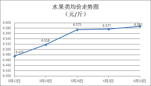 水果类商品价格小幅盘升。本周所监测的6种水果商品价格波动情况为4涨2跌,综合零售均价为6.587元/斤,环比上涨0.15%。其中苹果、香蕉、葡萄零售均价分别为每斤7.16元、3.24元、13.04元,环比分别上涨0.28%、上涨1.89%、下降0.15%。