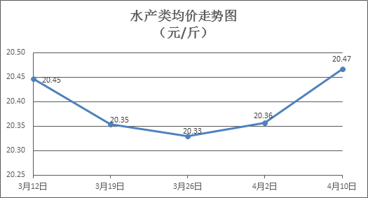 水产类商品价格走涨。本周所监测的10种水产商品价格波动情况为8涨1跌1平,综合均价为20.47元/斤,环比上涨0.54%。其中:草鱼、鲫鱼、鳙鱼、罗非鱼、基围虾零售均价分别为每斤10.94元、13.85元、10.18元、8.49元、38.80元,环比分别上涨0.27%、下降0.79%、上涨0.59%、上涨0.71%、上涨0.96%。