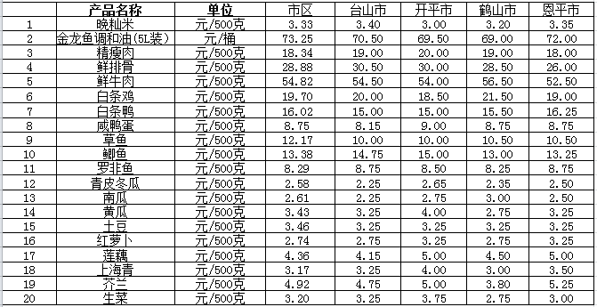 说明:1、表中价格为该地区监测点综合平均价;2、“市区”含蓬江区、江海区、新会区,价格分别采自蓬江市场、江南市场、城东市场等13家农贸市场;3、其他四个县市价格分别采自新华市场、锦江市场等8家农贸市场。