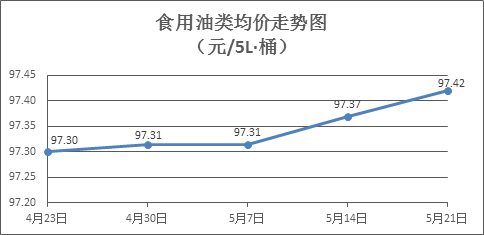 食用油类商品价格微幅盘升。上周所监测的9种食用油(5L装)商品价格波动情况为4涨3跌2平,综合零售均价为97.42元/桶,环比上涨0.05%。其中:鲁花花生油、金龙鱼调和油零售均价分别为每桶157.44元、71.54元,环比分别上涨0.02%、下降0.03%。