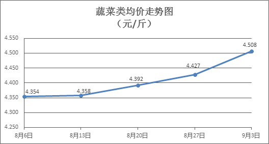 蔬菜类商品价格普遍上涨。上周所监测的32 种蔬菜商品价格波动情况为26涨3跌3平,综合零售均价为4.508元/斤,环比上涨1.81%。其中:涨幅居前的品种包括生菜、丝瓜、大白菜,零售均价分别为每斤3.76元、4.09元、2.98元,环比分别上涨6.21%、5.96%、4.93%;跌幅居前的品种包括莲藕、青皮冬瓜、青尖椒,零售均价分别为每斤4.56元、2.42元、4.71元,环比分别下降1.51%、0.82%、0.21%。