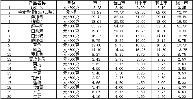 说明:1、表中价格为该地区监测点综合平均价;2、“市区”含蓬江区、江海区、新会区,价格分别采自蓬江市场、江南市场、城东市场等13家农贸市场;3、其他四个县市价格分别采自新华市场、锦江市场等8家农贸市场。