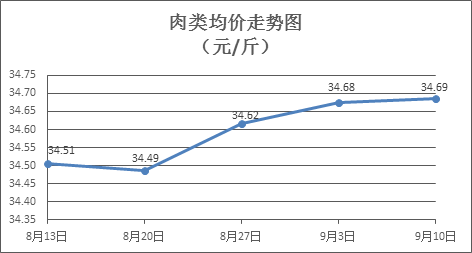 肉类商品价格微幅上涨。上周所监测的8种肉类商品价格波动情况为6涨2跌,综合零售均价为34.69元/斤,环比上涨0.03%。其中:排骨、精瘦肉、有皮上肉、牛肉、带骨羊肉零售均价分别为每斤29.87元、19.00元、14.30元、53.99元、44.91元,环比分别上涨0.13%、上涨1.28%、上涨0.28%、上涨0.09%、下降0.75%。