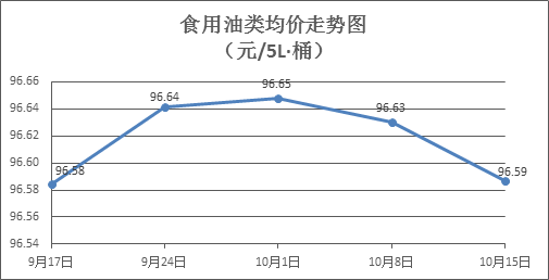 食用油类商品价格微幅盘整。上周所监测的9种食用油(5L装)商品价格波动情况为5涨1跌3平,综合零售均价为96.59元/桶,环比下降0.04%。其中:胡姬花花生油、大豆油零售均价分别为每桶146.25元、60.59元,环比分别下降0.85%、上涨0.10%。