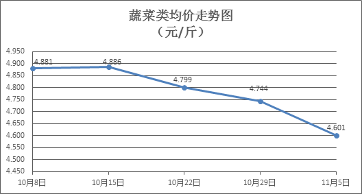 蔬菜类商品价格普遍下降。上周所监测的32 种蔬菜商品价格波动情况为3涨27跌2平,综合零售均价为4.601元/斤,环比下降3.03%。其中:涨幅居前的品种包括蒜头、生姜、莲藕,零售均价分别为每斤8.17元、11.11元、4.70元,环比分别上涨1.49%、0.91%、0.21%;跌幅居前的品种为奶白菜、西洋菜、菠菜,零售均价为每斤4.33元、5.90元、6.10元,环比分别下降8.07%、7.67%、6.73%。