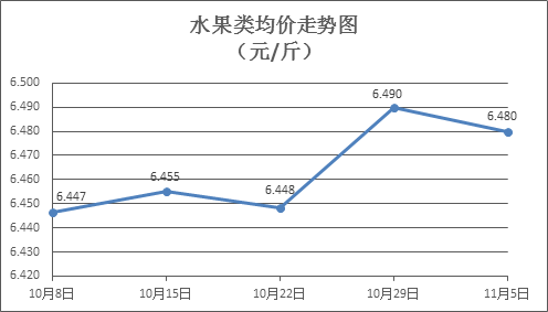 水果类商品价格略有下降。上周所监测的6种水果商品价格波动情况为2涨3跌1平,综合零售均价为6.480元/斤,环比下降0.15%。其中苹果、香蕉、葡萄零售均价分别为每斤7.35元、3.05元、13.10元,环比分别下降0.27%、下降0.33%、上涨0.15%。