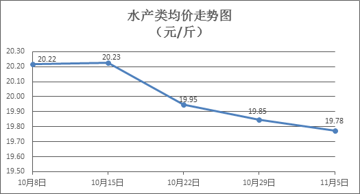 水产类商品价格总体略降。上周所监测的10种水产商品价格波动情况为2涨7跌1平,综合均价为19.78元/斤,环比下降0.36%。其中:草鱼、鲢鱼、鲫鱼、罗非鱼、基围虾零售均价分别为每斤10.94元、9.53元、14.00元、8.44元、32.42元,环比分别下降0.64%、下降0.52%、下降0.85%、持平、下降0.61%。