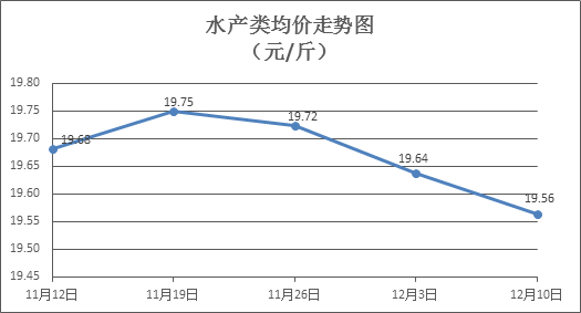 水产类商品价格略有下降。上周所监测的10种水产商品价格波动情况为1涨7跌2平,综合均价为19.56元/斤,环比下降0.38%。其中:草鱼、鲢鱼、鲫鱼、罗非鱼、基围虾零售均价分别为每斤10.95元、9.17元、13.84元、8.45元、32.35元,环比分别下降0.09%、持平、持平、下降0.71%、上涨0.15%。