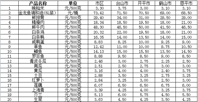 说明:1、表中价格为该地区监测点综合平均价;2、“市区”含蓬江区、江海区、新会区,价格分别采自蓬江市场、江南市场、城东市场等13家农贸市场;3、其他四个县市价格分别采自新华市场、锦江市场等8家农贸市场。