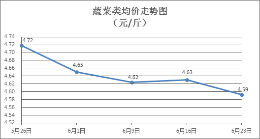 蔬菜类商品价格普遍下降。所监测的32 种蔬菜商品价格波动情况为6涨22跌4平,综合零售均价为每斤4.59元,环比下降0.80%。其中:涨幅居前的品种包括西洋菜、苦瓜、菠菜,零售均价分别为每斤4.90元、5.11元、5.66元,环比分别上涨9.87%、3.23%、1.98%;跌幅靠前的品种包括西红柿、花菜、丝瓜,零售均价分别为每斤4.36元、4.67元、4.79元,环比分别下降4.60%、3.91%、3.61%。
